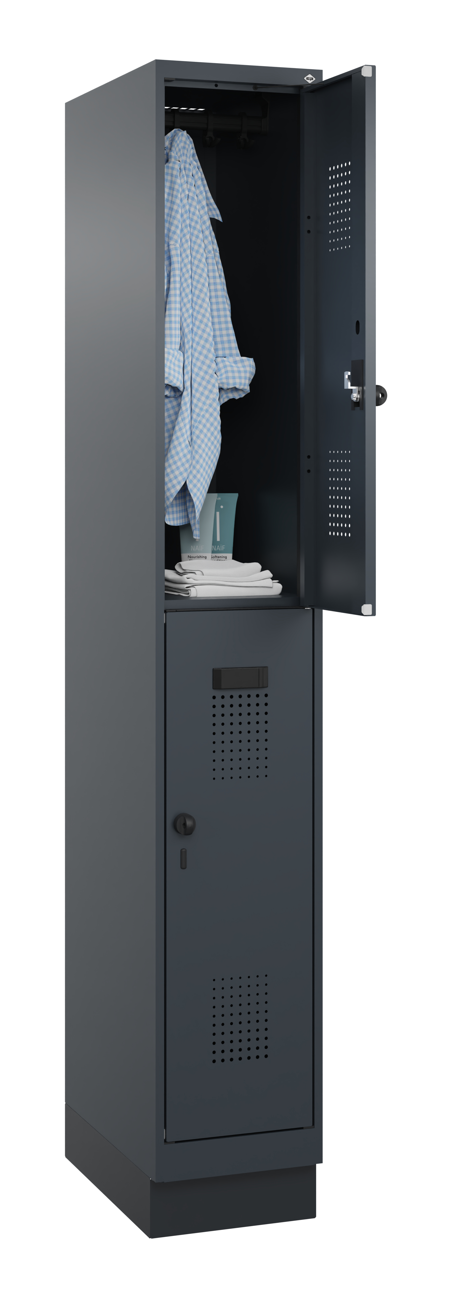 Die Lieferung des Garderobenschranks erfolgt standardmäßig mit Sicherheits-Drehriegel. Wahlweise kann dieser jedoch auch mit einem Zylinderschloss mit 2 Schlüsseln ohne Mehrpreis bestellt werden.
