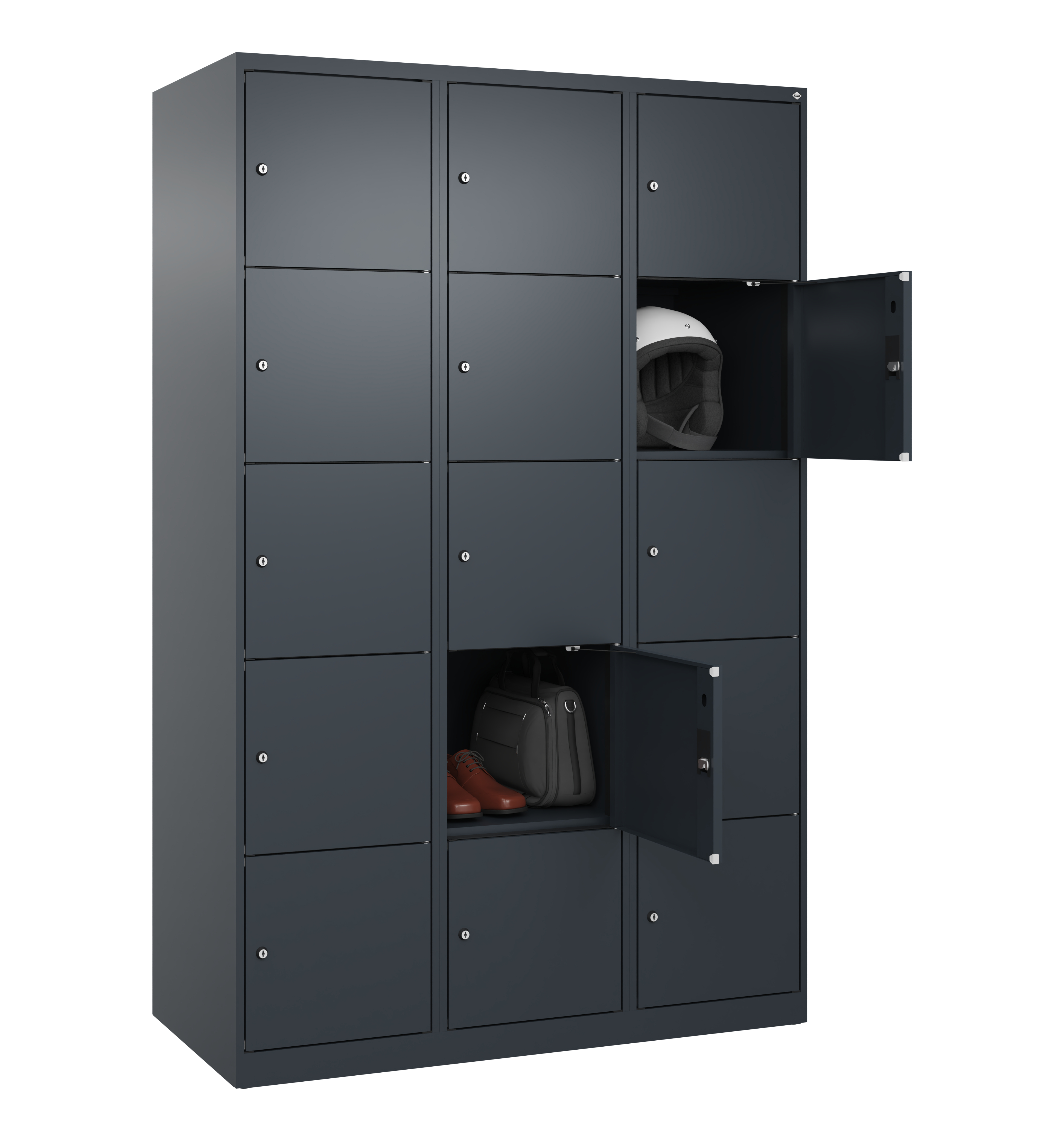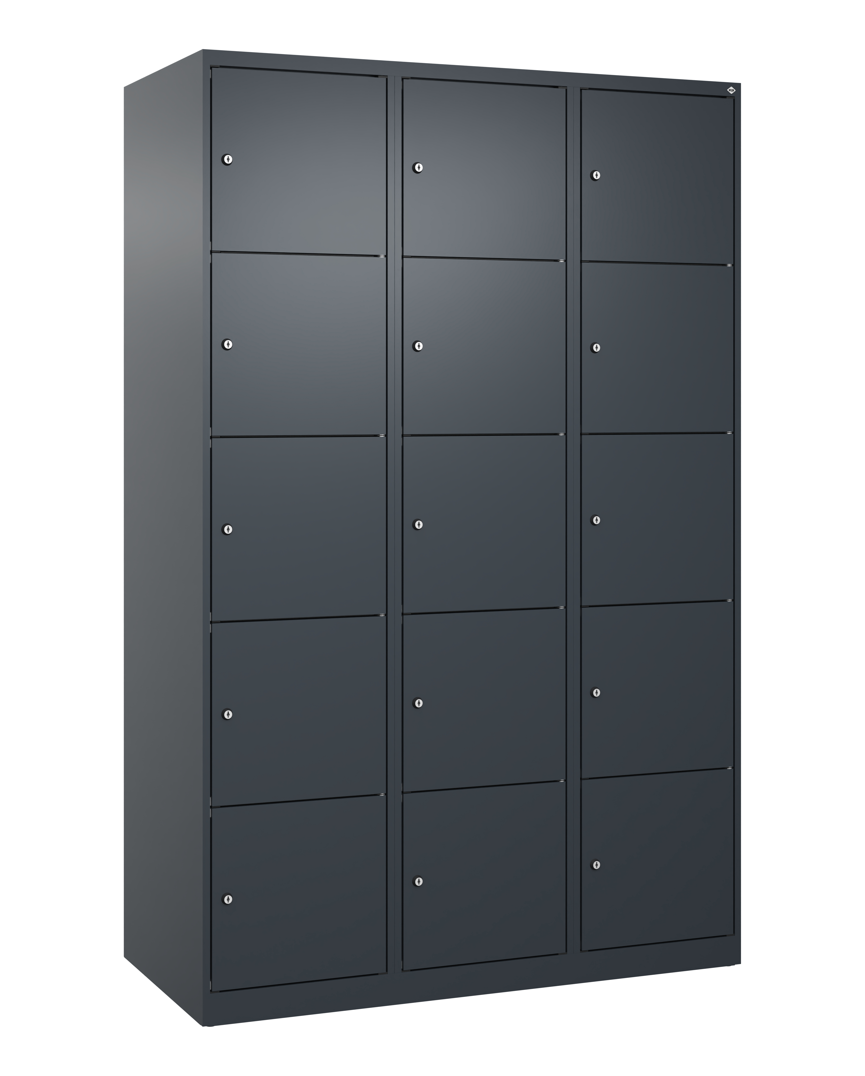 - Mit 3, 4 oder 5 Fächern übereinander, jedes Fach mit Zylinderschloss und 2 Schlüsseln, ohne Inneneinrichtung