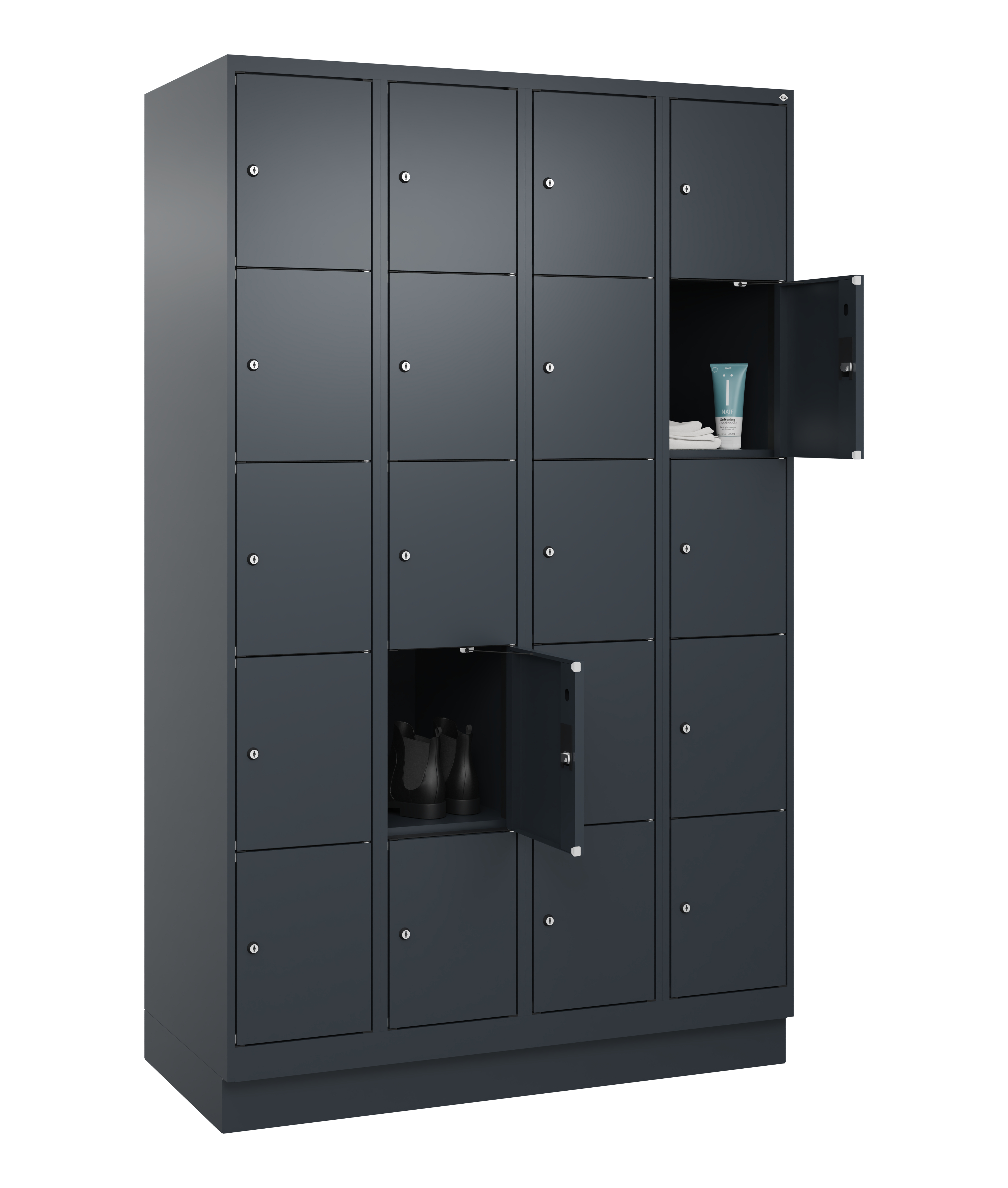 - Mit 3, 4 oder 5 Fächern übereinander, jedes Fach mit Zylinderschloss und 2 Schlüsseln, ohne Inneneinrichtung
