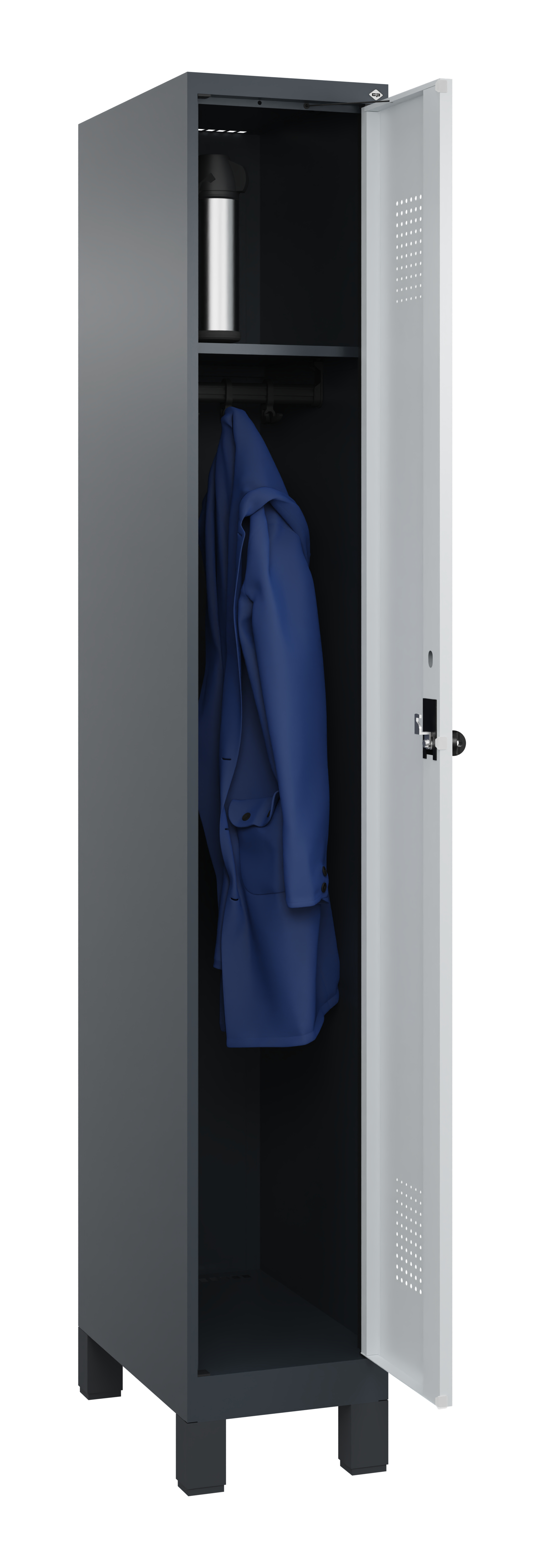 - Innen pro Abteil 1 fest verschweißter Ablageboden, darunter stabile Garderobenstange mit 3 verdrehsicheren Doppel-Schiebehaken