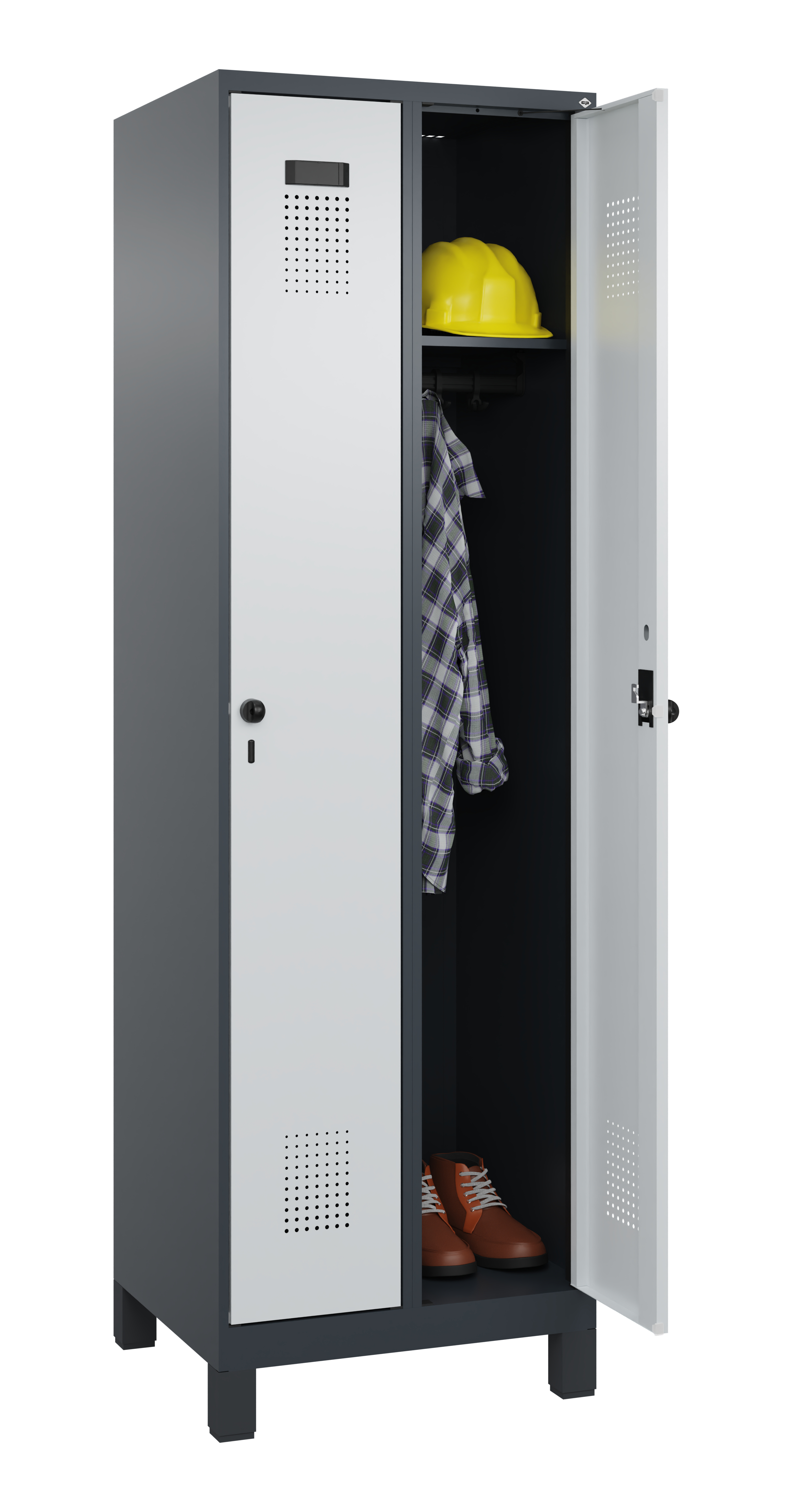 - Innen pro Abteil 1 fest verschweißter Ablageboden, darunter stabile Garderobenstange mit 3 verdrehsicheren Doppel-Schiebehaken