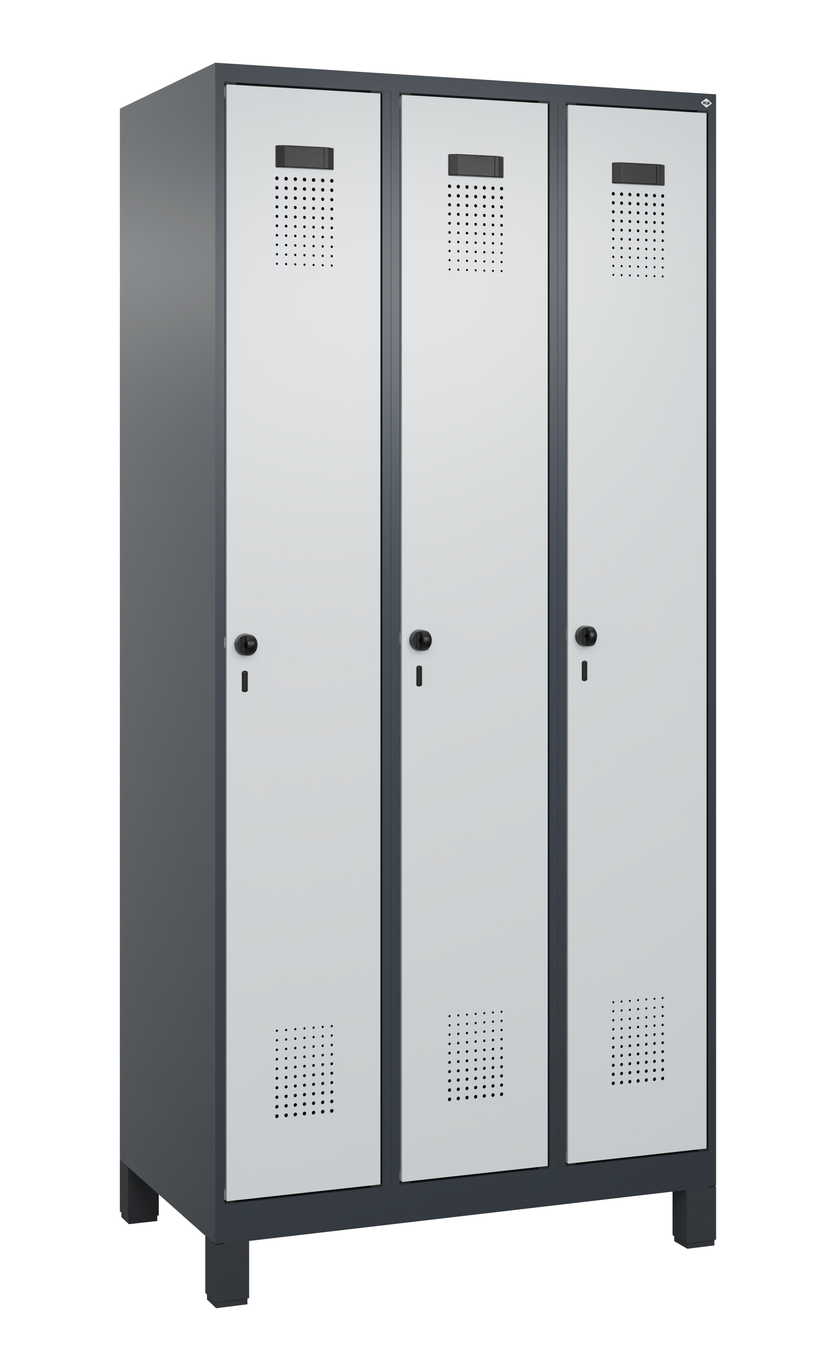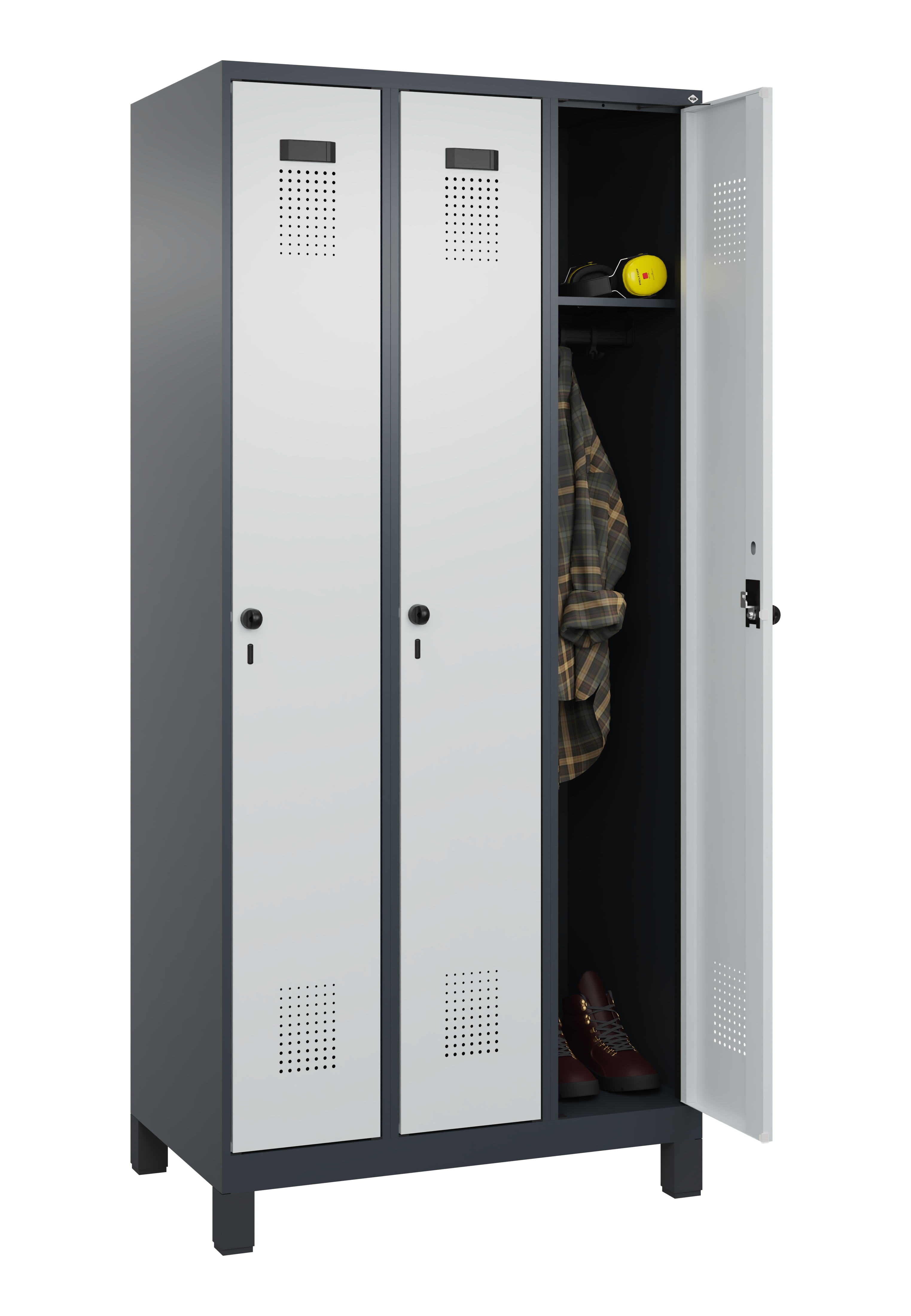 - Innen pro Abteil 1 fest verschweißter Ablageboden, darunter stabile Garderobenstange mit 3 verdrehsicheren Doppel-Schiebehaken