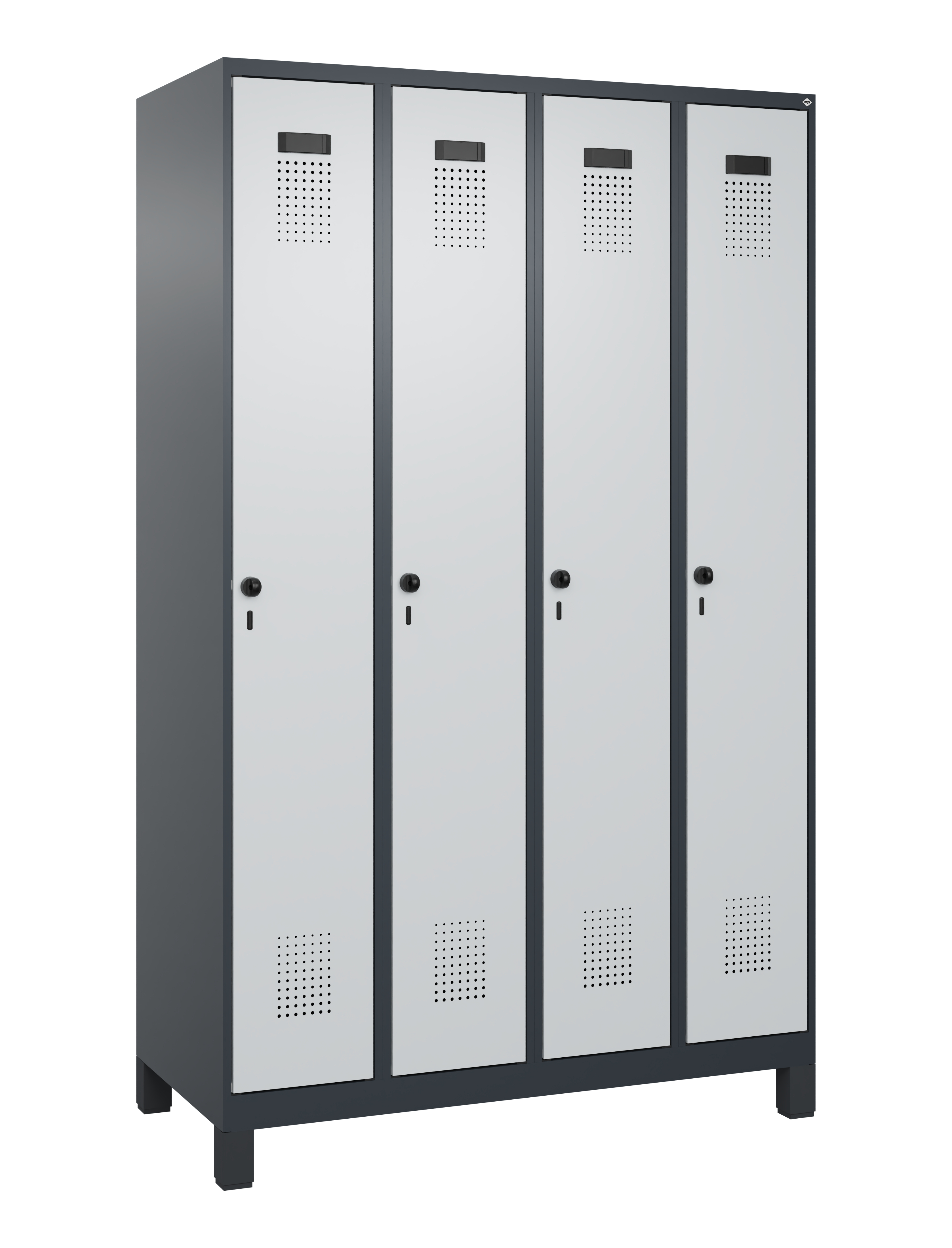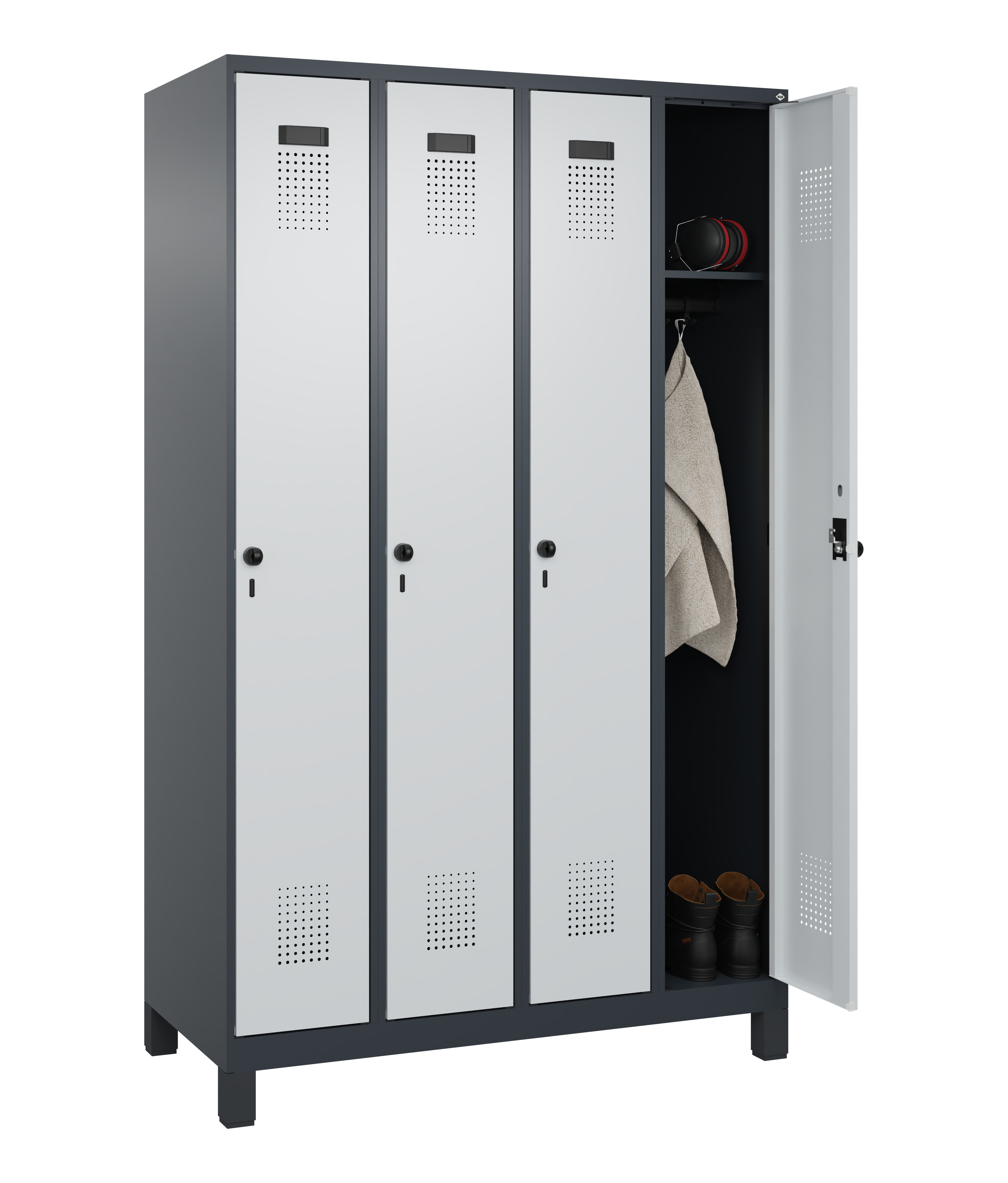 - Innen pro Abteil 1 fest verschweißter Ablageboden, darunter stabile Garderobenstange mit 3 verdrehsicheren Doppel-Schiebehaken