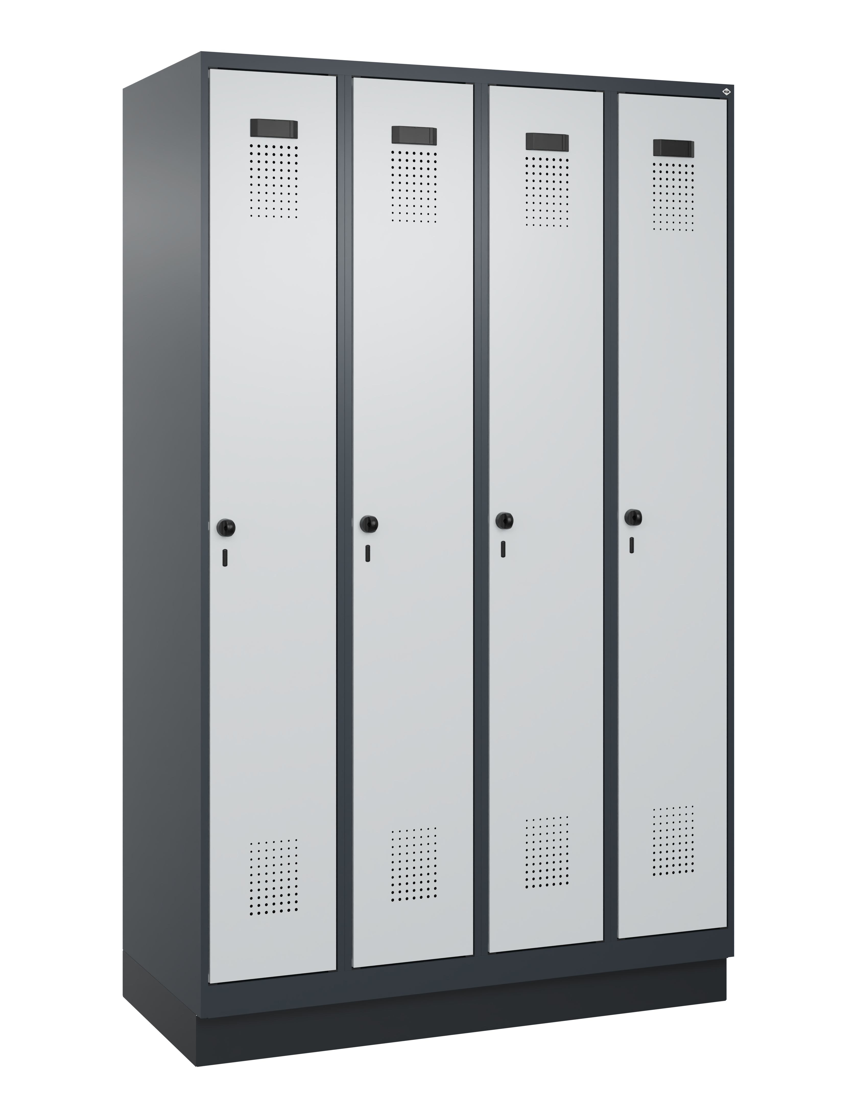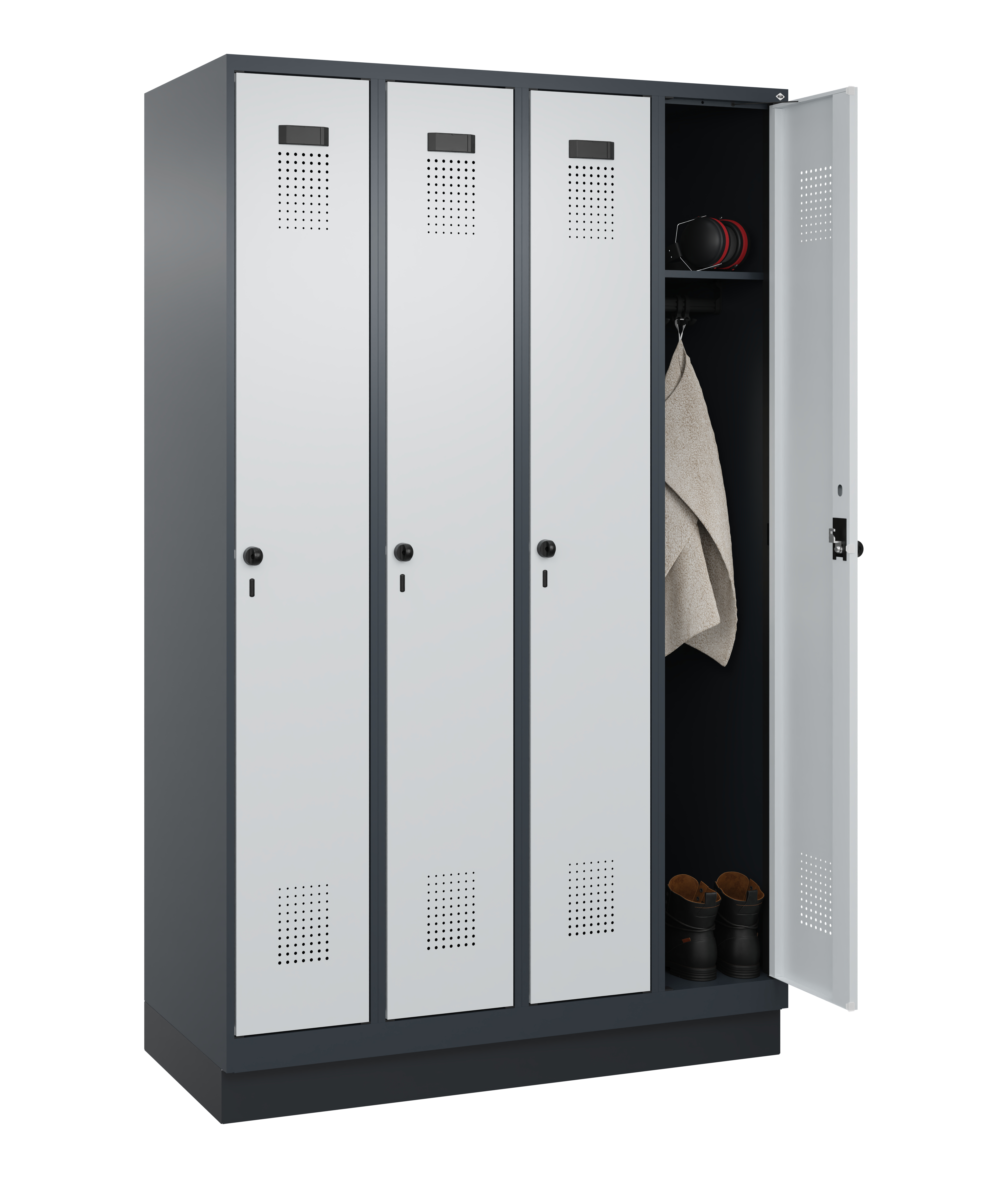 - Innen pro Abteil 1 fest verschweißter Ablageboden, darunter stabile Garderobenstange mit 3 verdrehsicheren Doppel-Schiebehaken