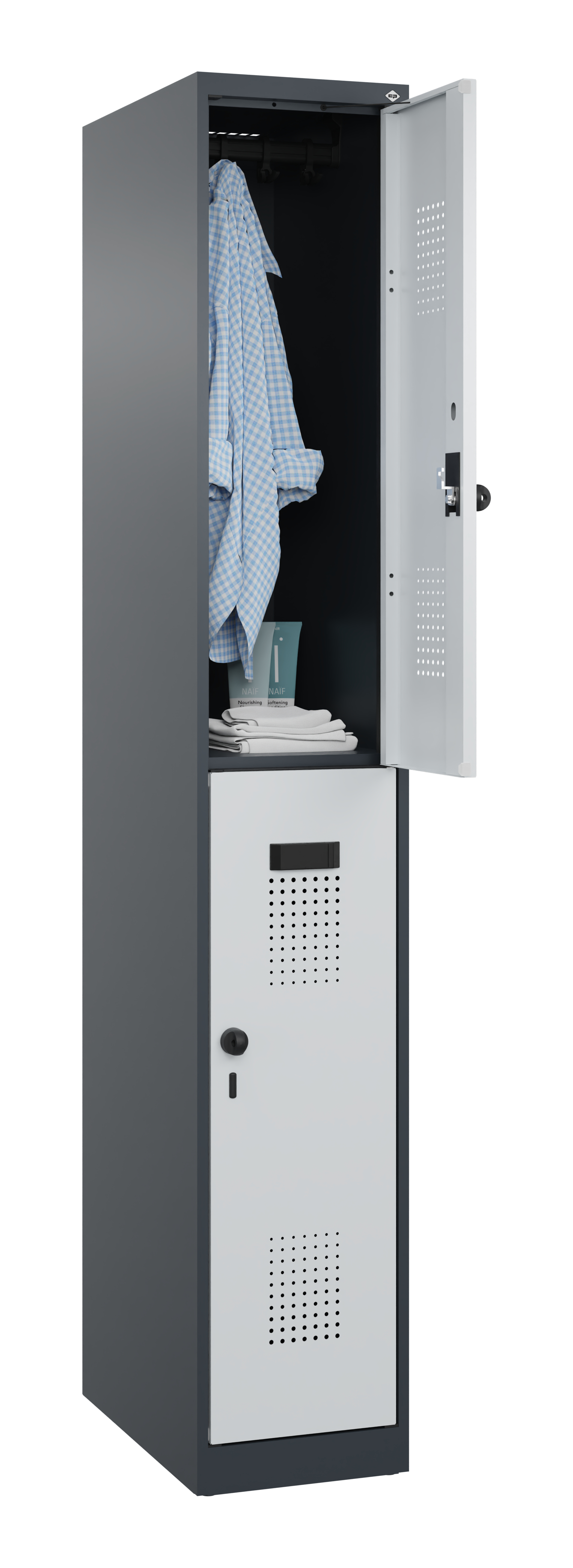 Die Lieferung des Garderobenschranks erfolgt standardmäßig mit Sicherheits-Drehriegel. Wahlweise kann dieser jedoch auch mit einem Zylinderschloss mit 2 Schlüsseln ohne Mehrpreis bestellt werden.