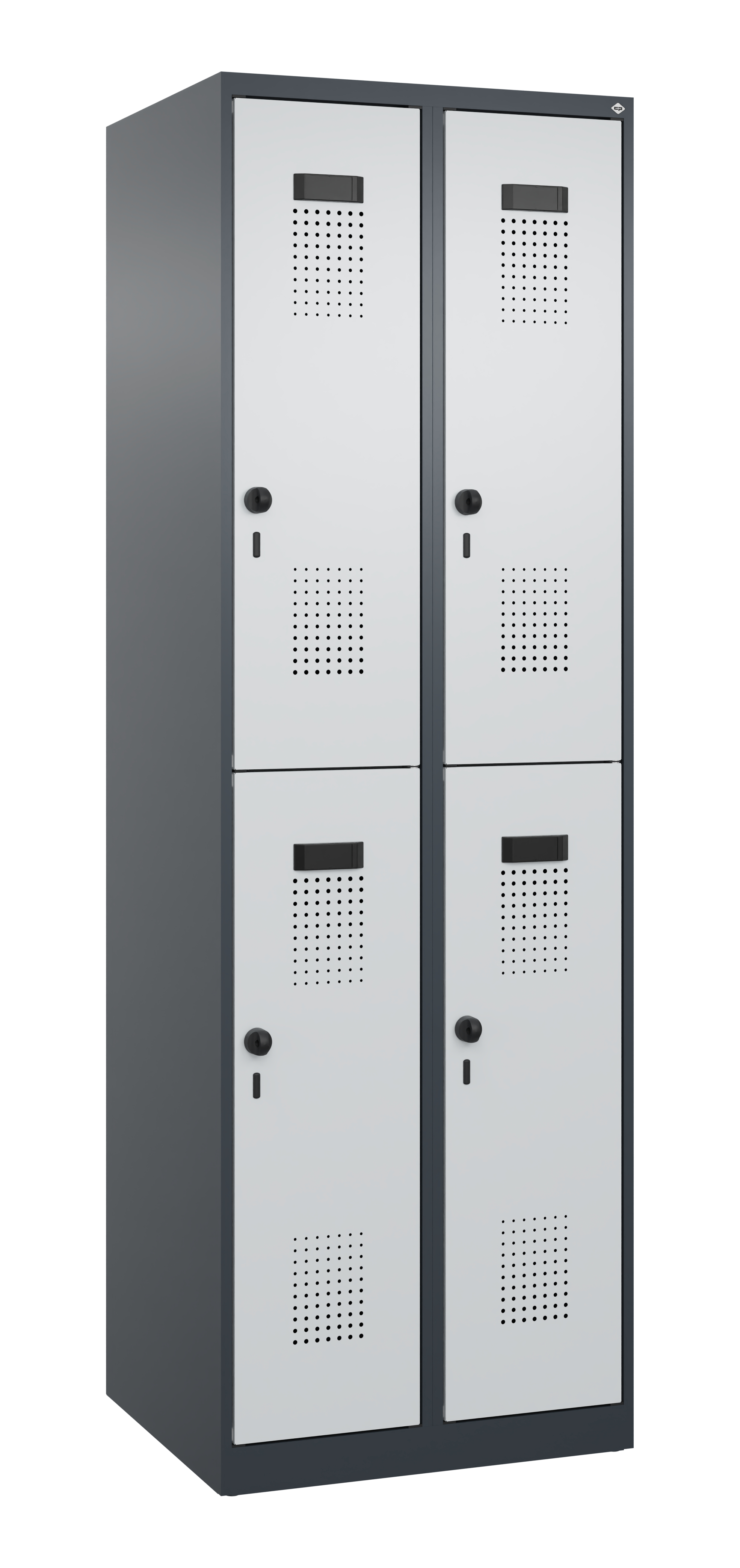 - Verstärkte Türen rechts angeschlagen mit Anschlagdämpfer, Belüftungs-Lochbild und Comfort-Etikettenrahmen sowie Sicherheits-Drehriegel für Vorhangschloss, inkl. Türschutz