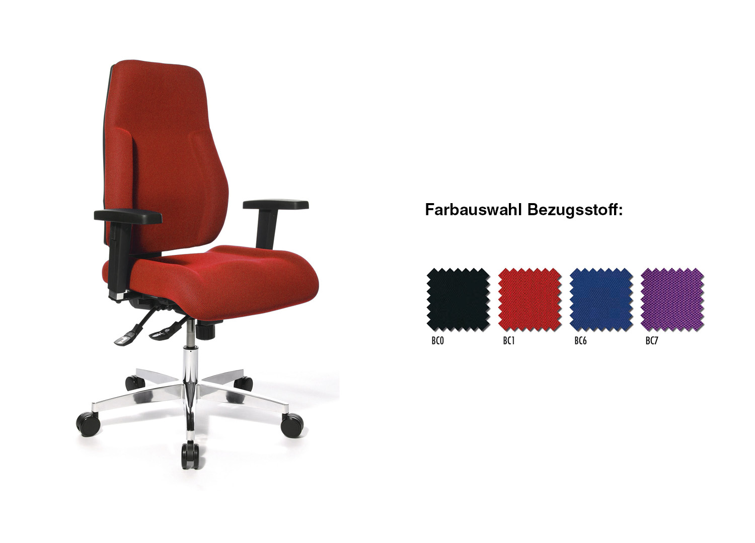 - Punktsynchronmechanik zur synchronen Verstellung der Sitz- und Rückenlehnen-Neigung, Federkraft individuell auf das Körpergewicht einstellbar, stufenlos arretierbar.