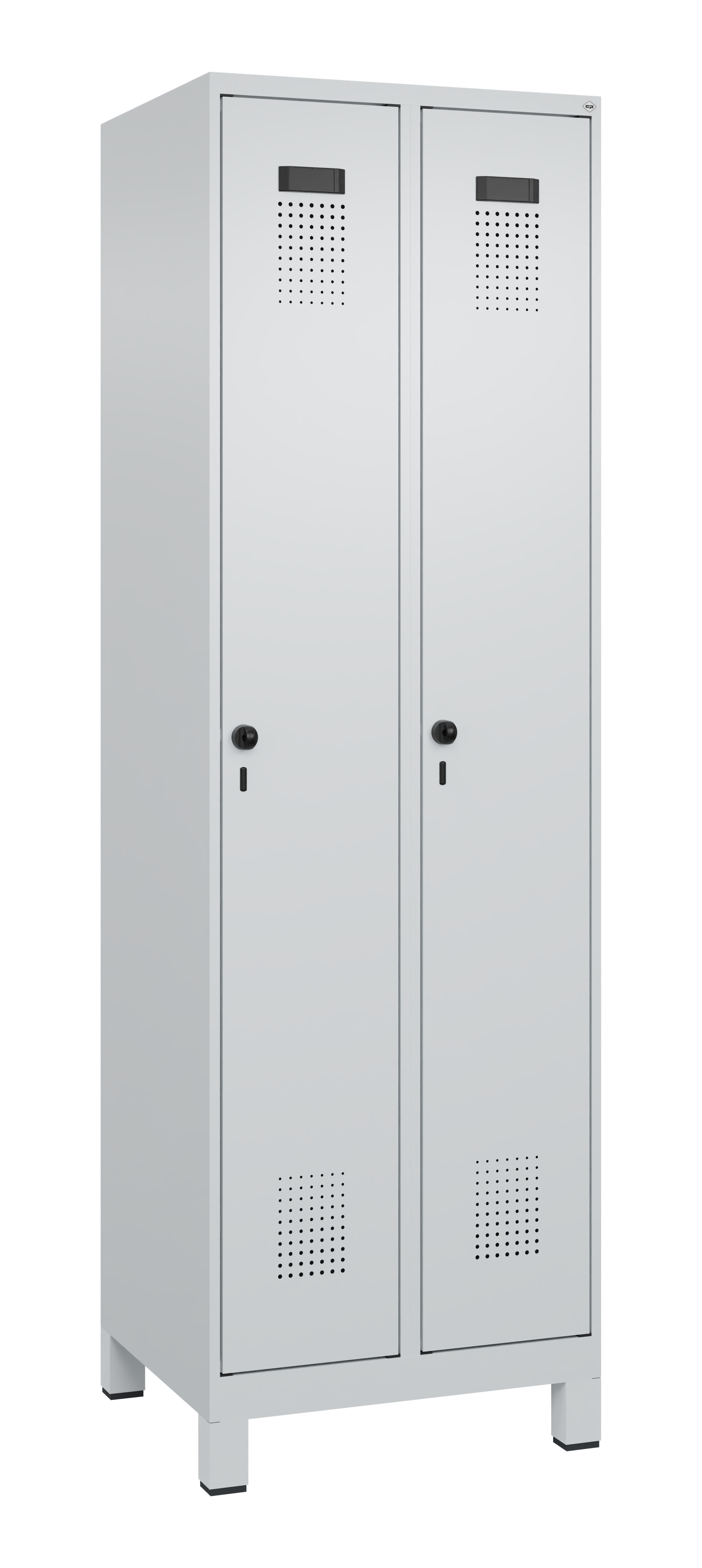 - Verstärkte Türen rechts angeschlagen mit Anschlagdämpfer, Belüftungs-Lochbild und Comfort-Etikettenrahmen sowie Sicherheits-Drehriegel für Vorhangschloss, inkl. Türschutz