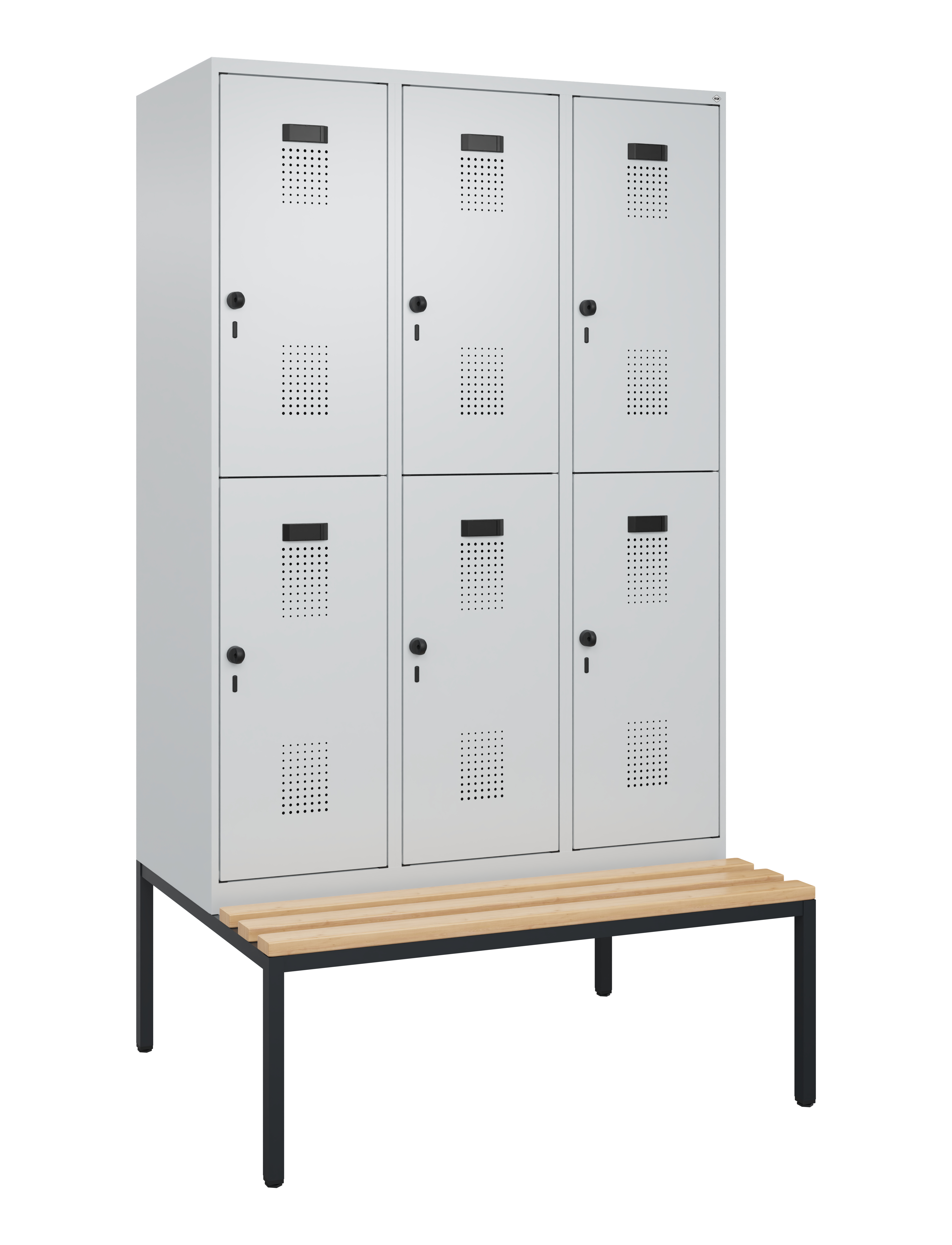 - Verstärkte Türen rechts angeschlagen mit Anschlagdämpfer, Belüftungs-Lochbild und Comfort-Etikettenrahmen sowie Sicherheits-Drehriegel für Vorhangschloss, inkl. Türschutz