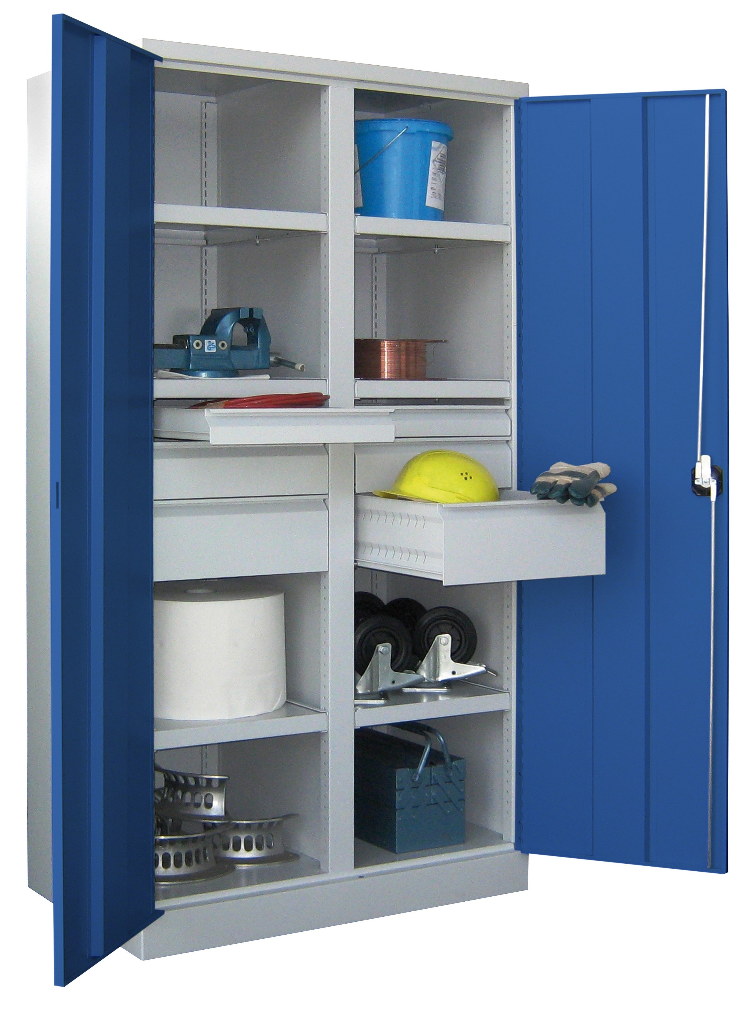 - Die Flügeltüren sind mit Verstärkungstaschen ausgestattet und über einen Drehgriff mit integriertem Zylinderschloss (über drei Riegel) zu verschließen.