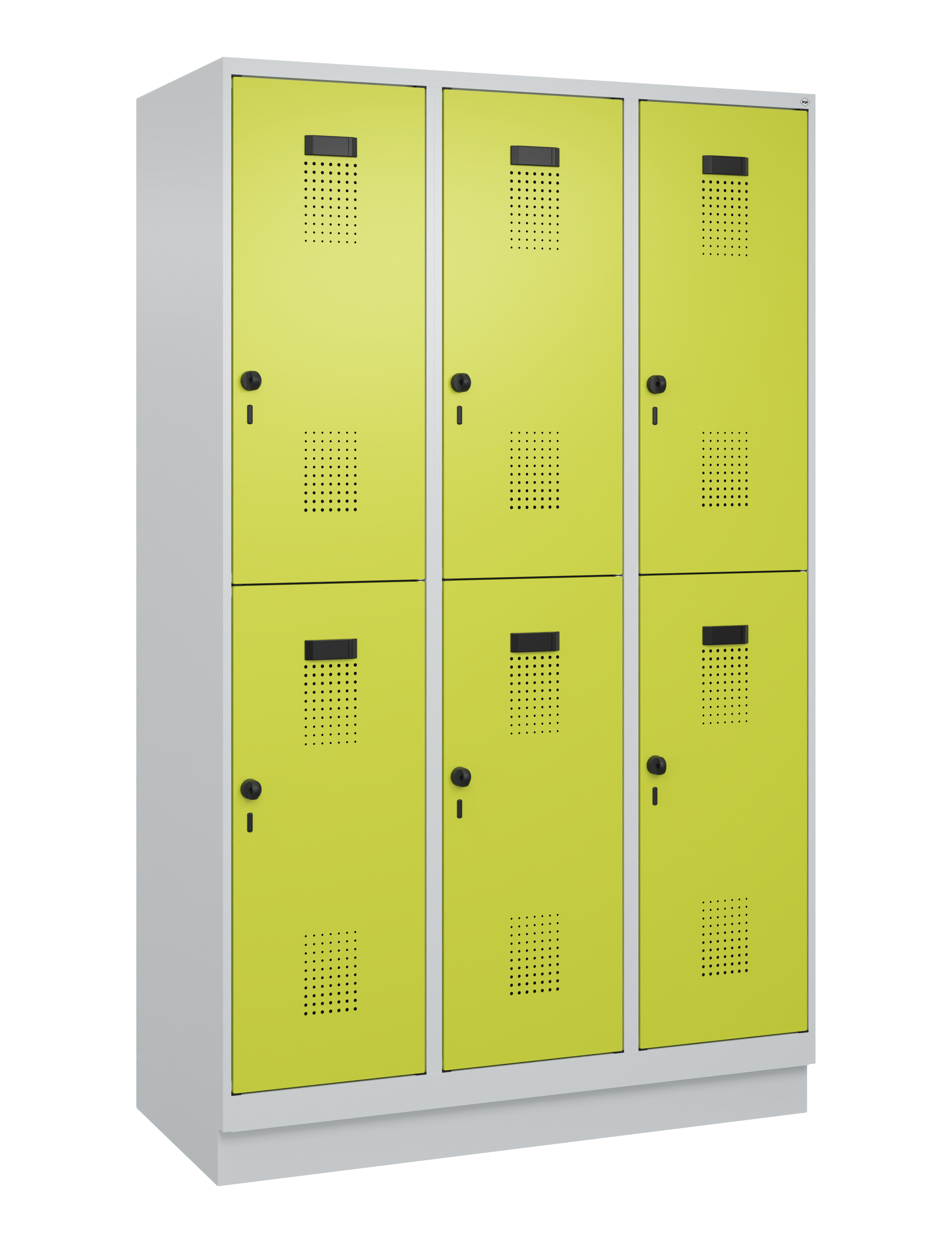 - Verstärkte Türen rechts angeschlagen mit Anschlagdämpfer, Belüftungs-Lochbild und Comfort-Etikettenrahmen sowie Sicherheits-Drehriegel für Vorhangschloss, inkl. Türschutz