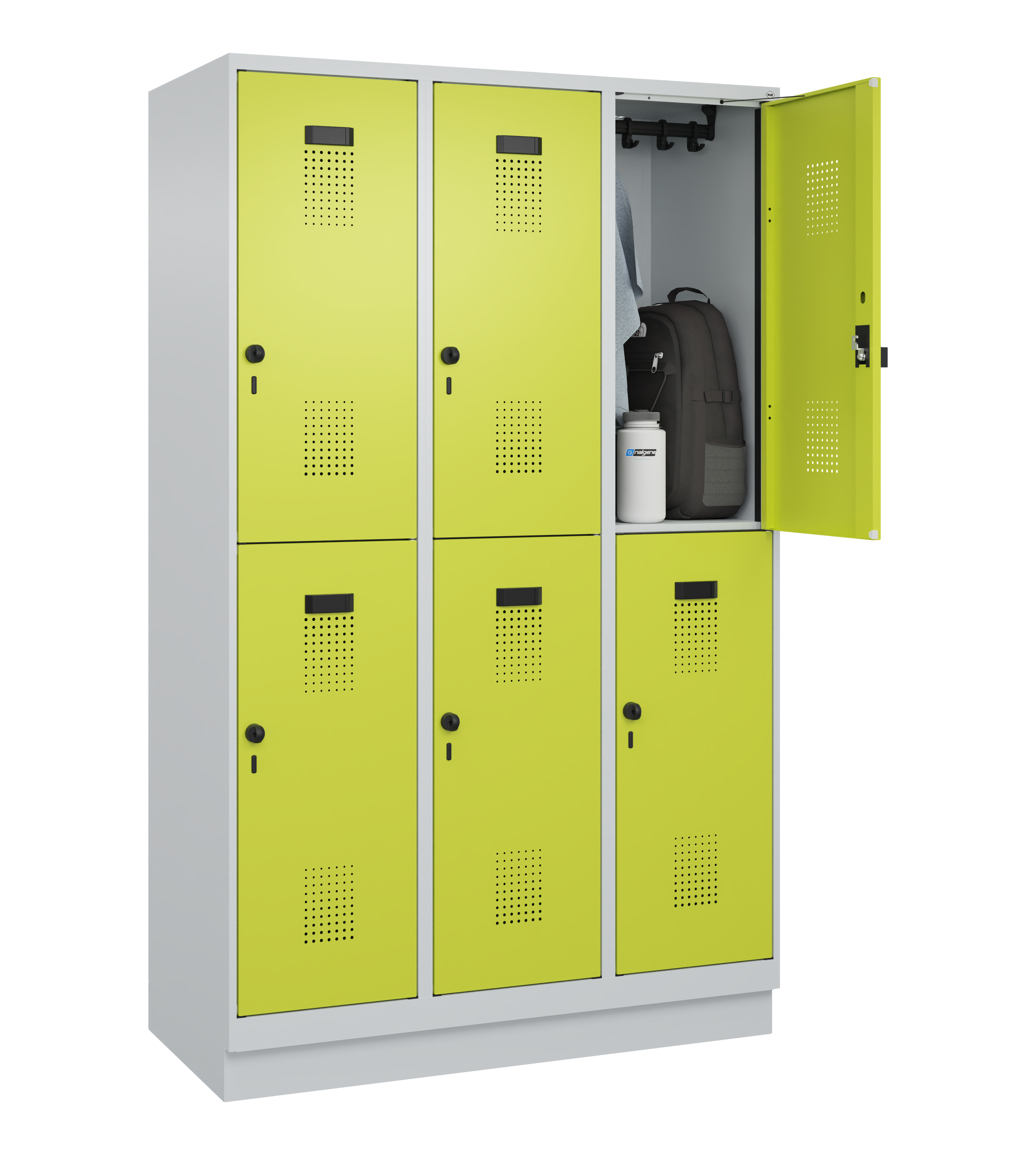 Die Lieferung des Garderobenschranks erfolgt standardmäßig mit Sicherheits-Drehriegel. Wahlweise kann dieser jedoch auch mit einem Zylinderschloss mit 2 Schlüsseln ohne Mehrpreis bestellt werden.