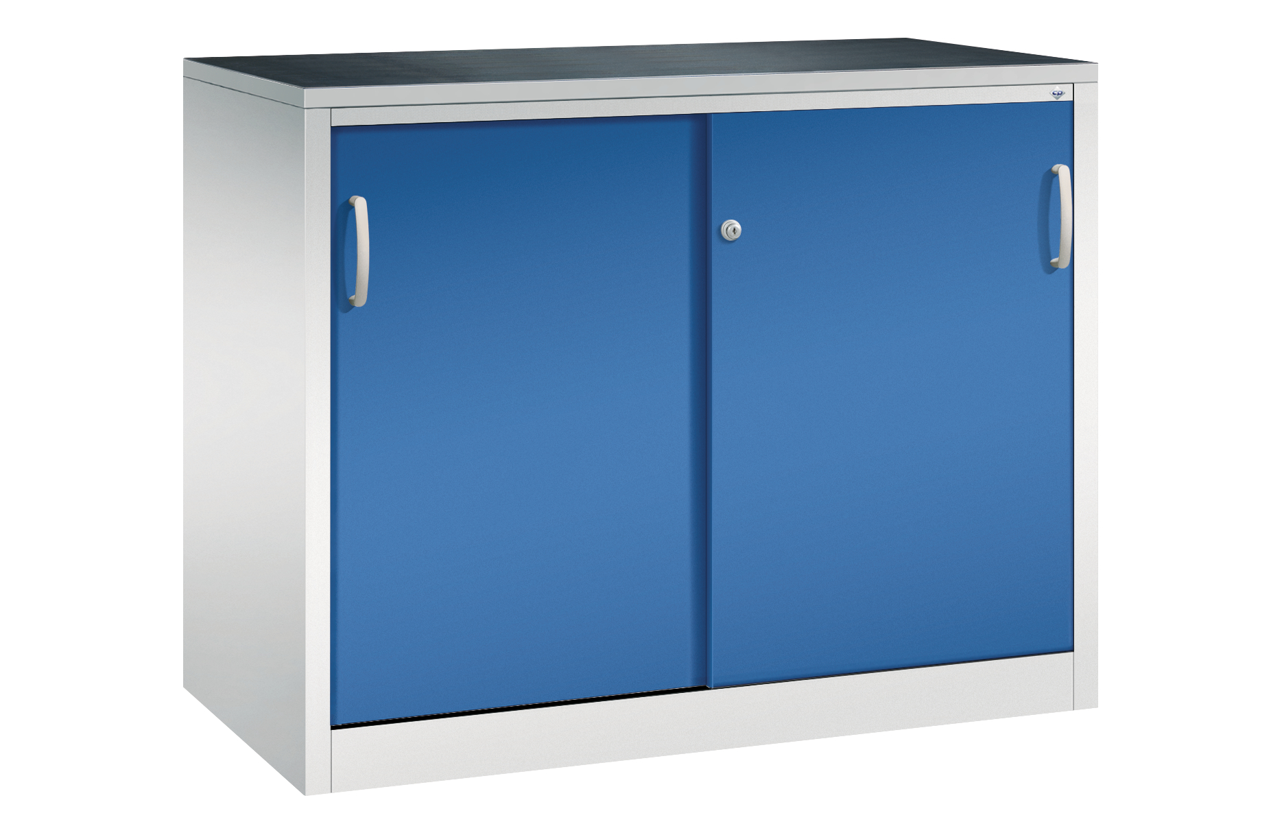 • Schiebetürenschrank: Lichtgrau RAL 7035/Enzianblau RAL 5010