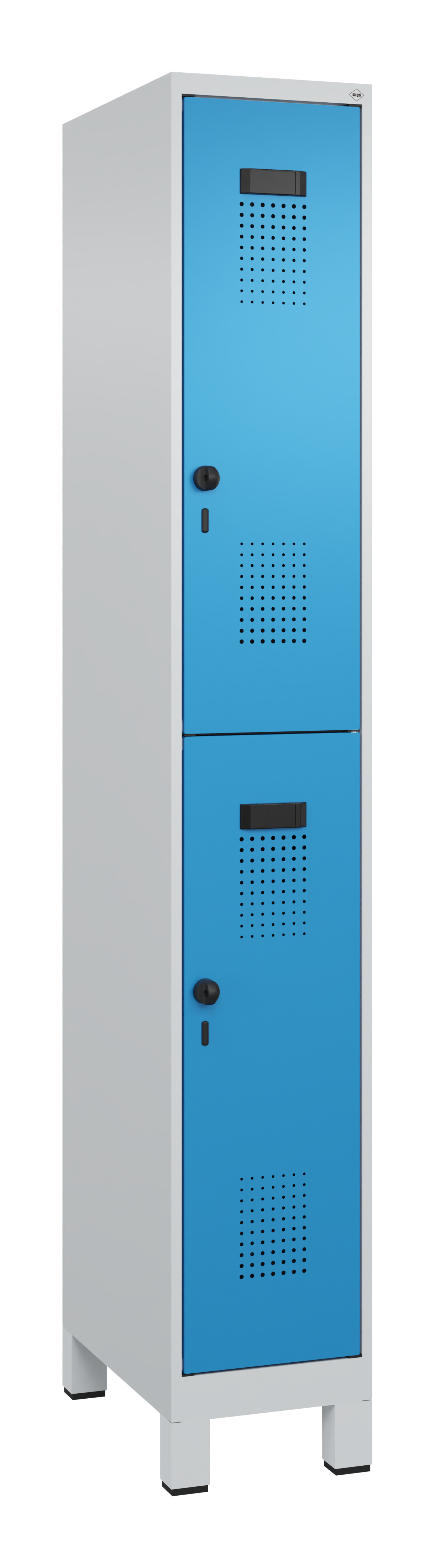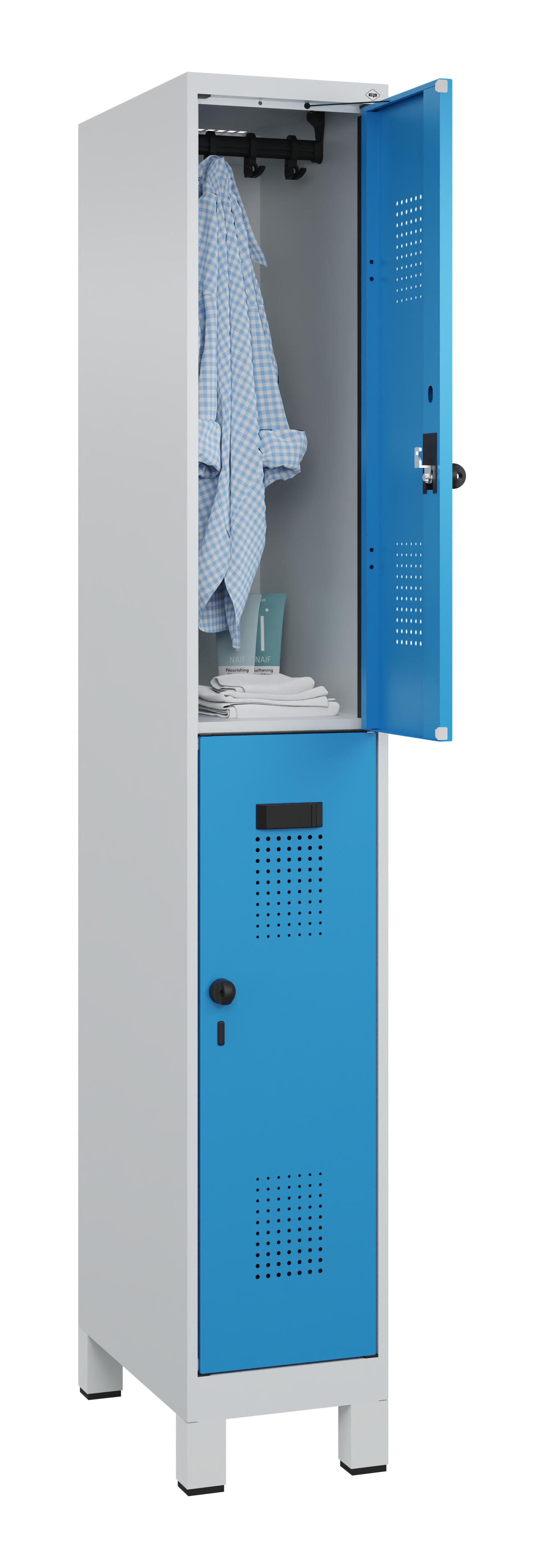 • Garderobenschrank mit Füßen: Lichtgrau RAL 7035/Lichtblau RAL 5012