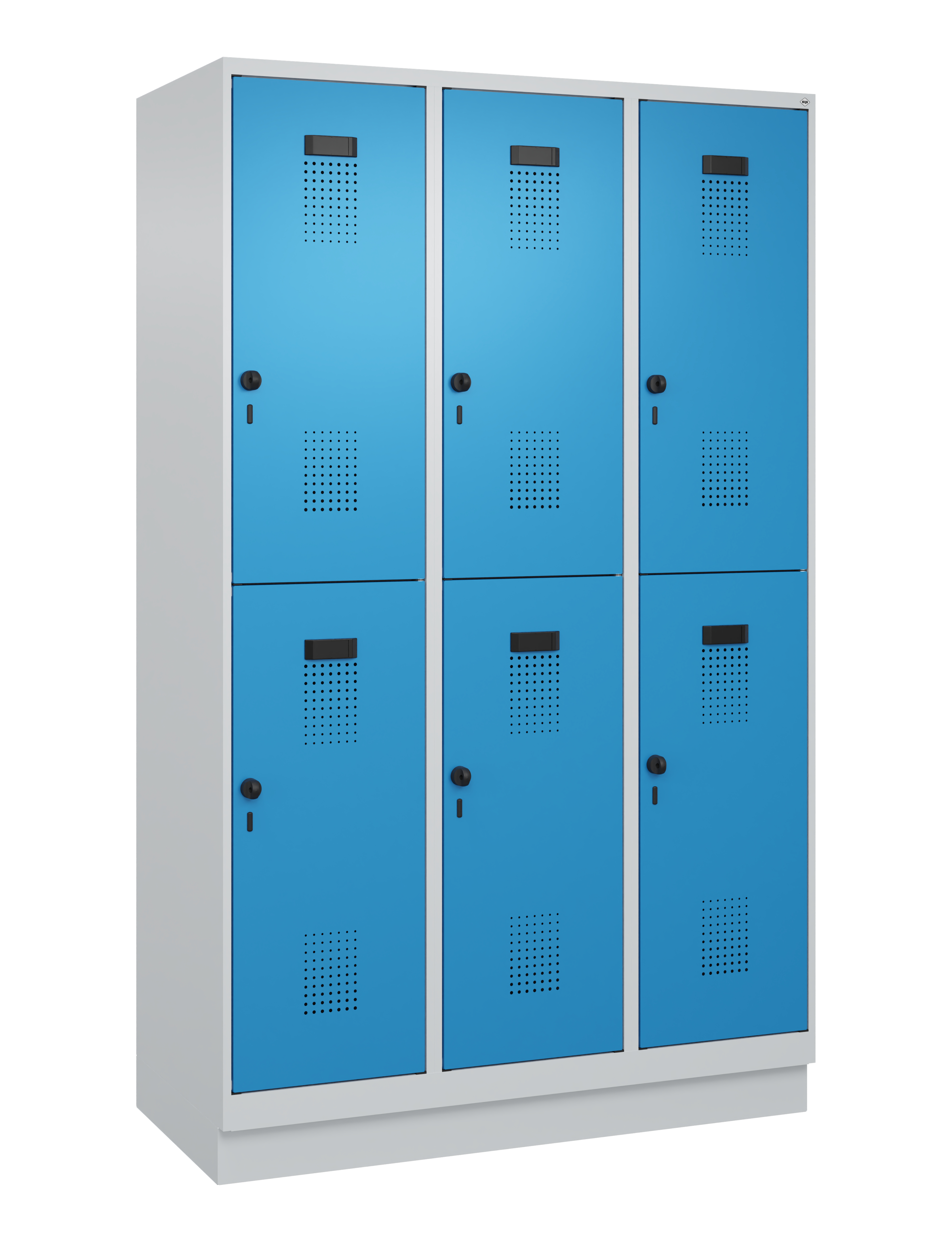- Verstärkte Türen rechts angeschlagen mit Anschlagdämpfer, Belüftungs-Lochbild und Comfort-Etikettenrahmen sowie Sicherheits-Drehriegel für Vorhangschloss, inkl. Türschutz