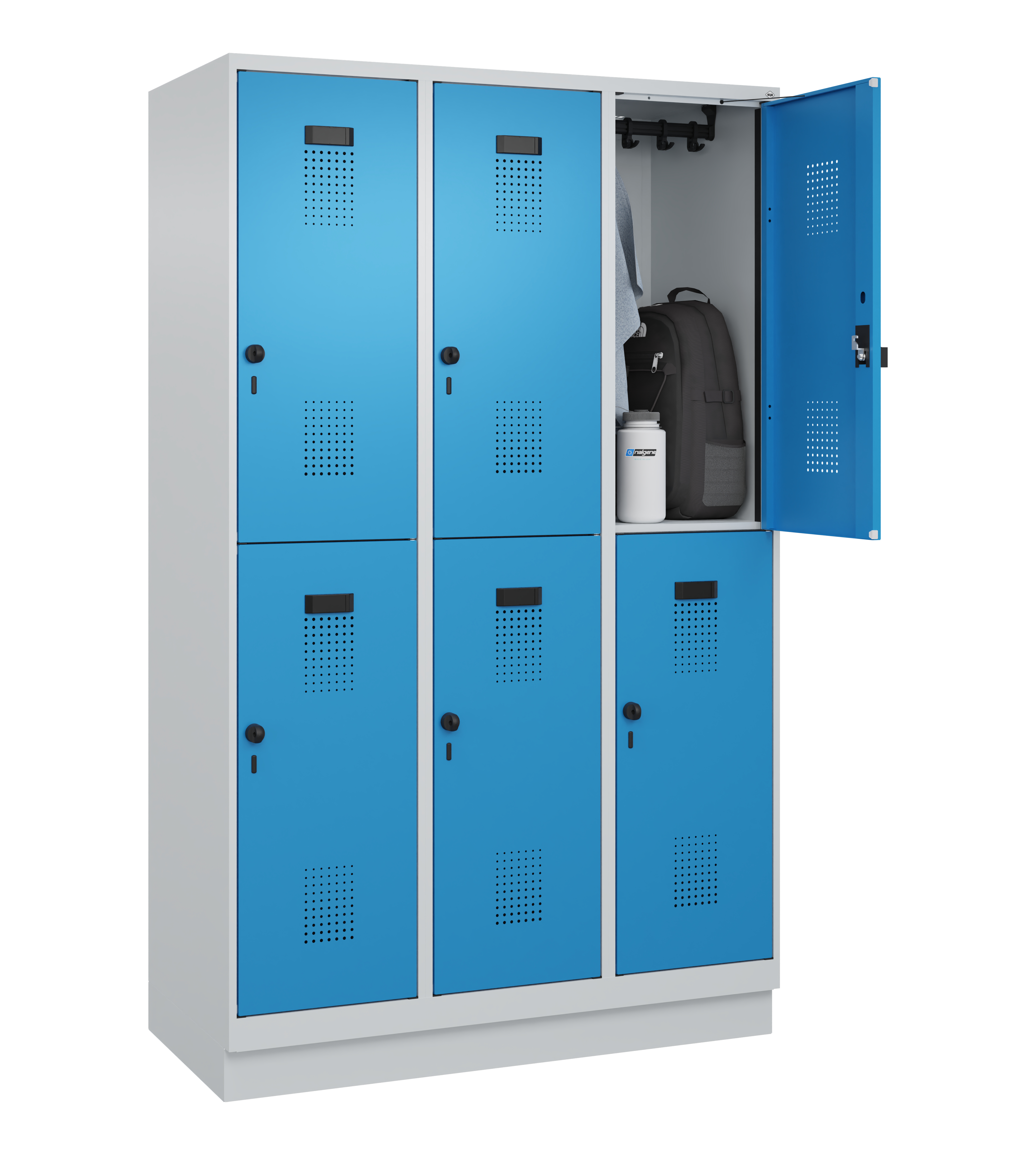 Die Lieferung des Garderobenschranks erfolgt standardmäßig mit Sicherheits-Drehriegel. Wahlweise kann dieser jedoch auch mit einem Zylinderschloss mit 2 Schlüsseln ohne Mehrpreis bestellt werden.