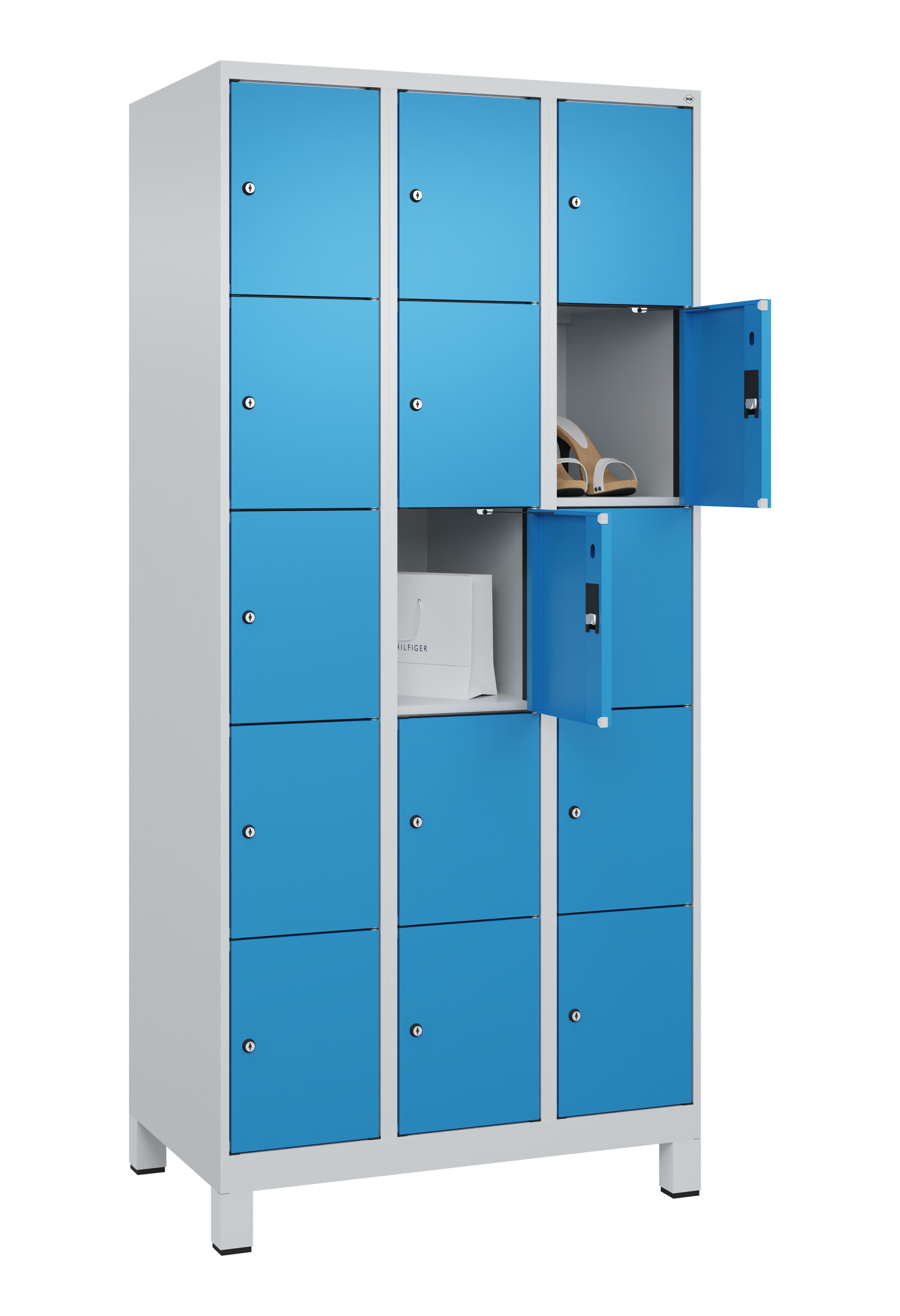 - Mit 3, 4 oder 5 Fächern übereinander, jedes Fach mit Zylinderschloss und 2 Schlüsseln, ohne Inneneinrichtung
