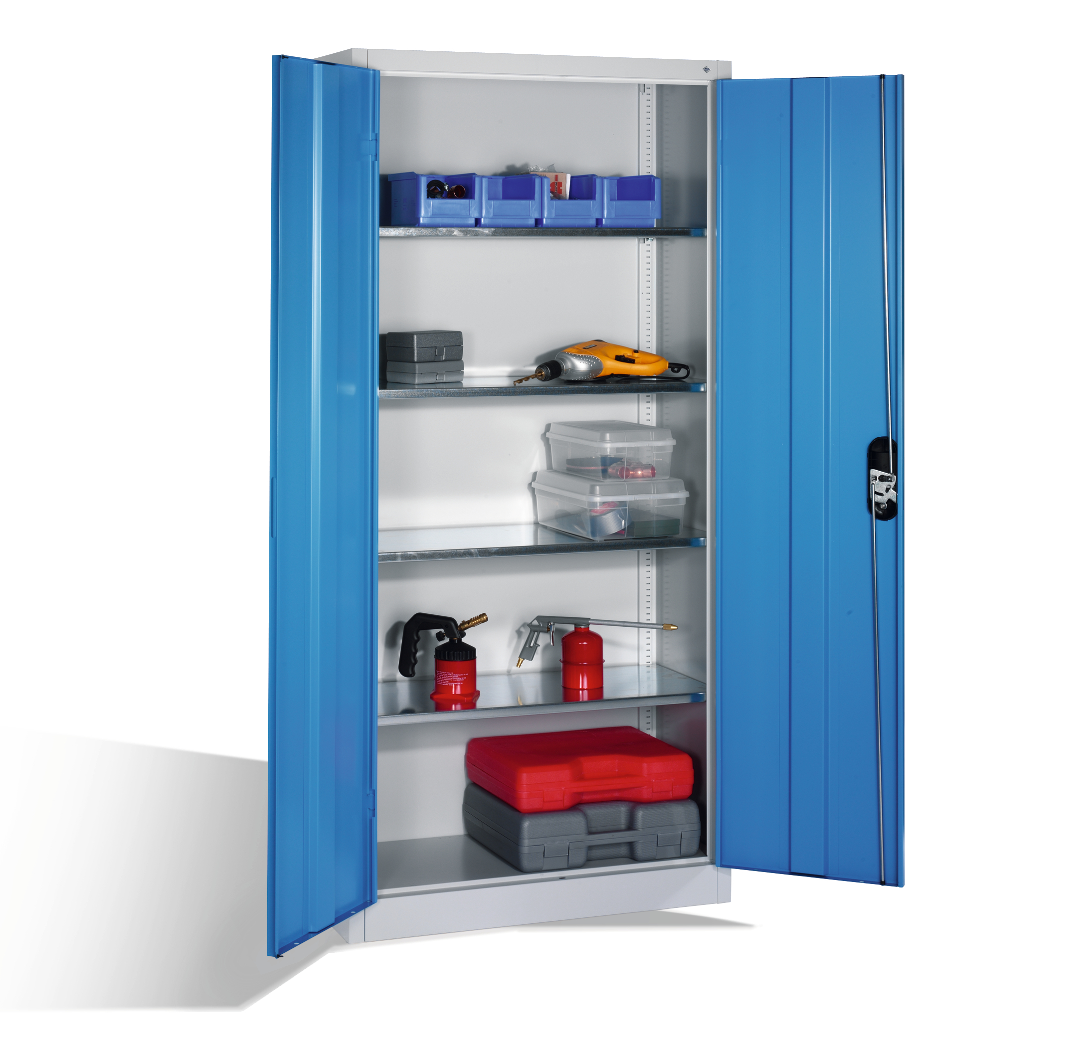 - 4 verzinkte Fachböden im Raster von 15 mm höhenverstellbar, Traglast bei gleichmäßig verteilter Last je Boden ca. 70 kg