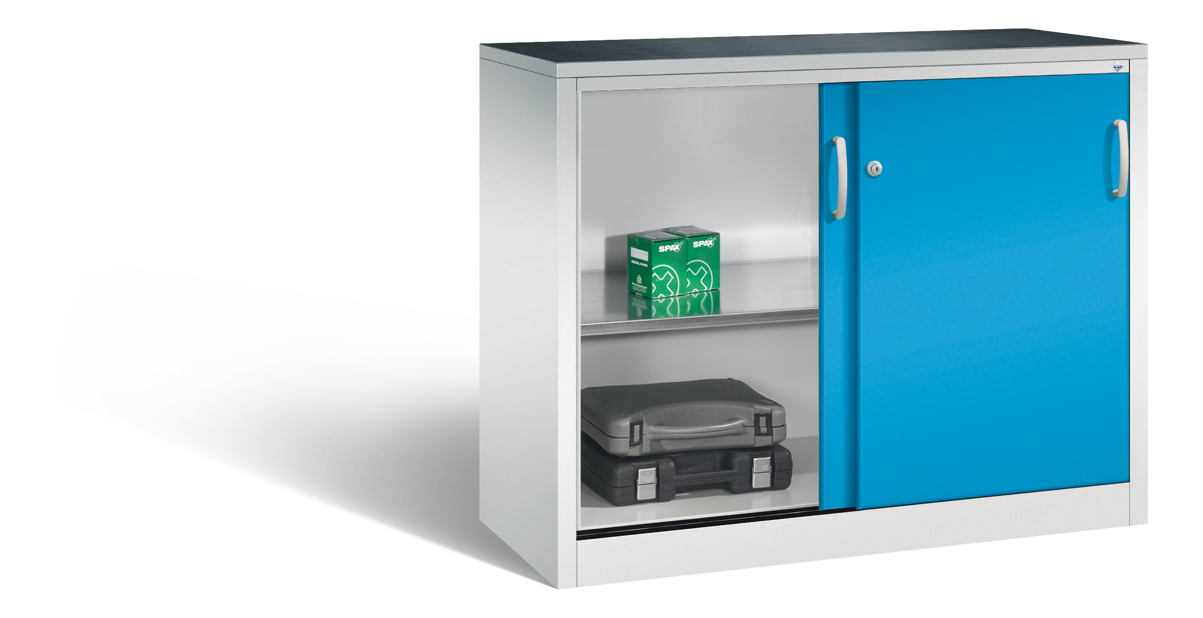 • Schiebetürenschrank: Lichtgrau RAL 7035/Lichtblau RAL 5012