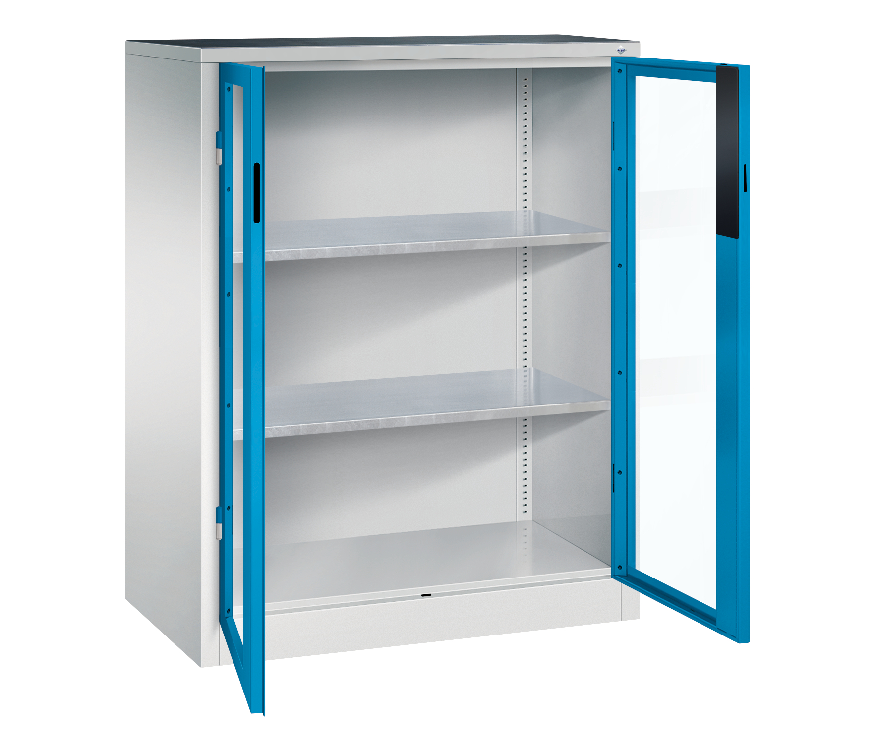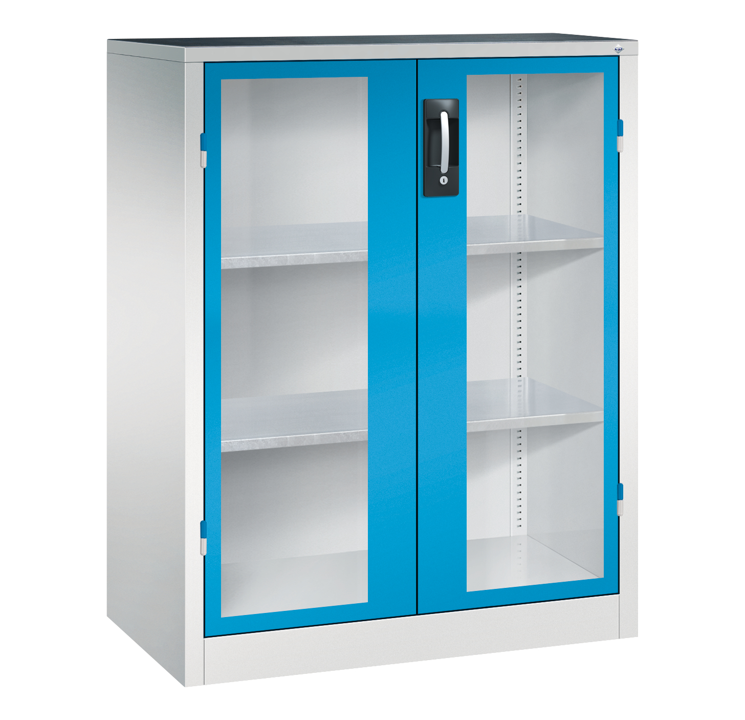 • Beistellschrank mit Sichtfenstern: Lichtgrau RAL 7035/Lichtblau RAL 5012
