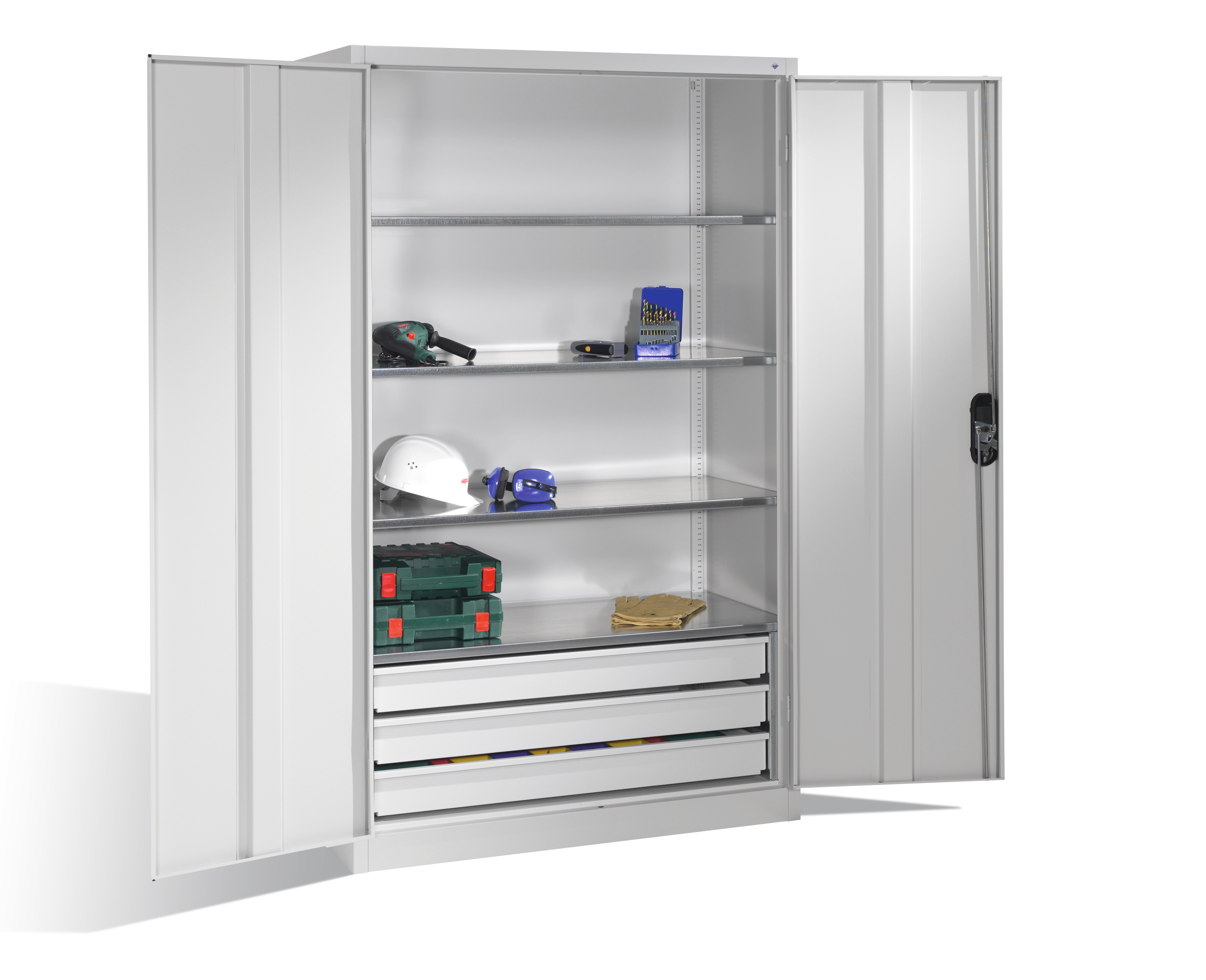 - Flügeltüren in außenliegenden Scharnieren (Türöffnungswinkel 180°) mit 3-riegeligem Muldengriffschloss "Ergo-Lock" mit 2 Schlüsseln