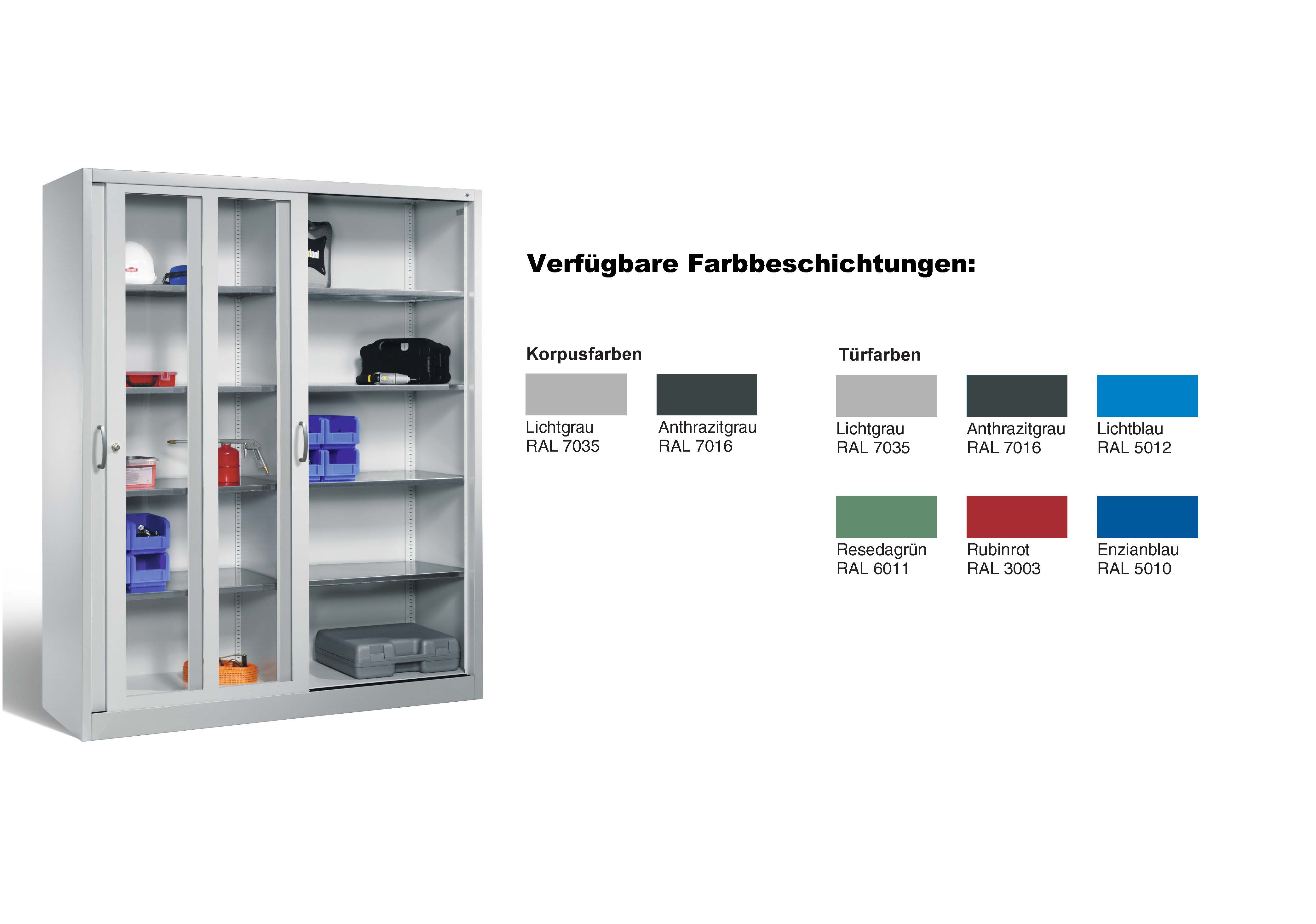 lichtgrau RAL 7035, lichtblau RAL 5012, resedagrün RAL 6011, rubinrot RAL 3003, enzianblau RAL 5010, anthrazitgrau RAL 7016