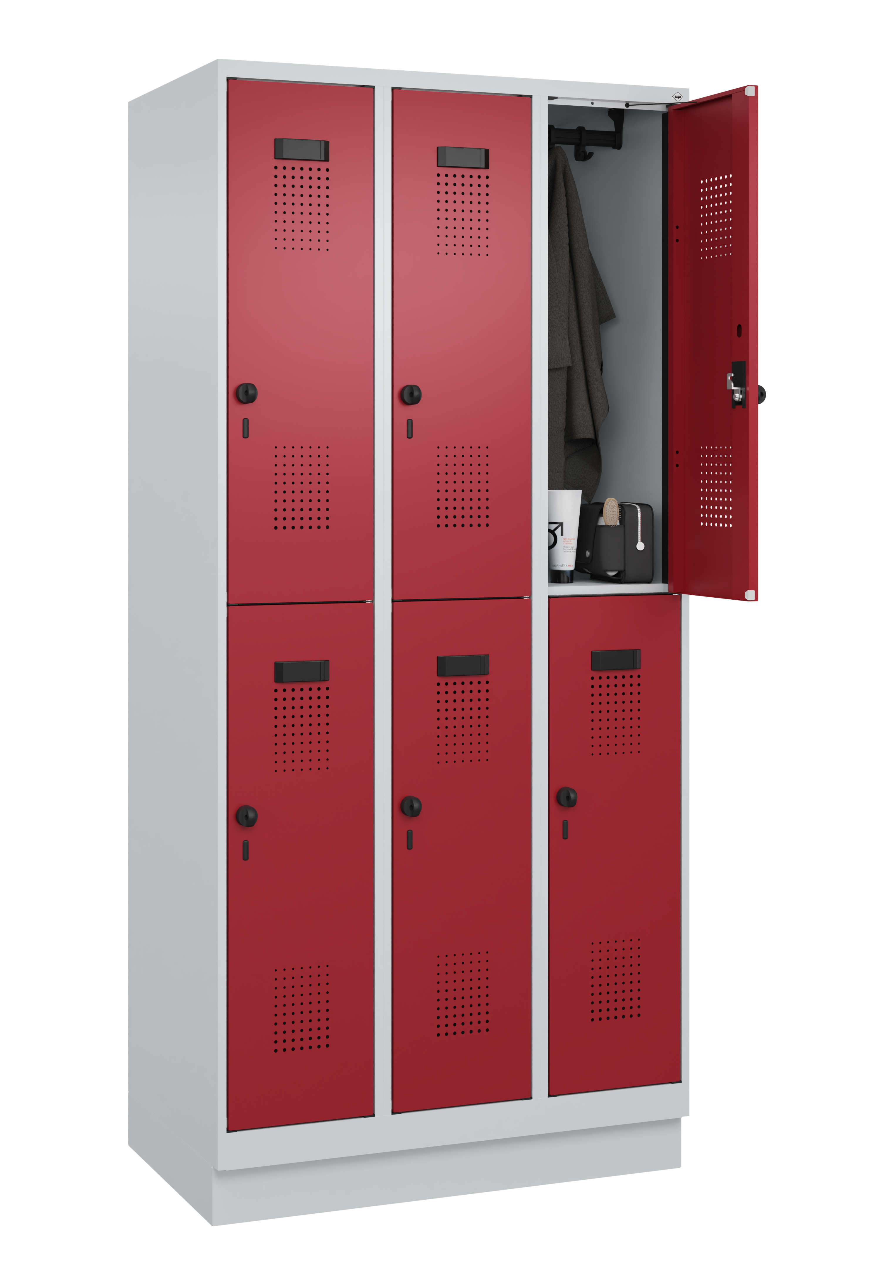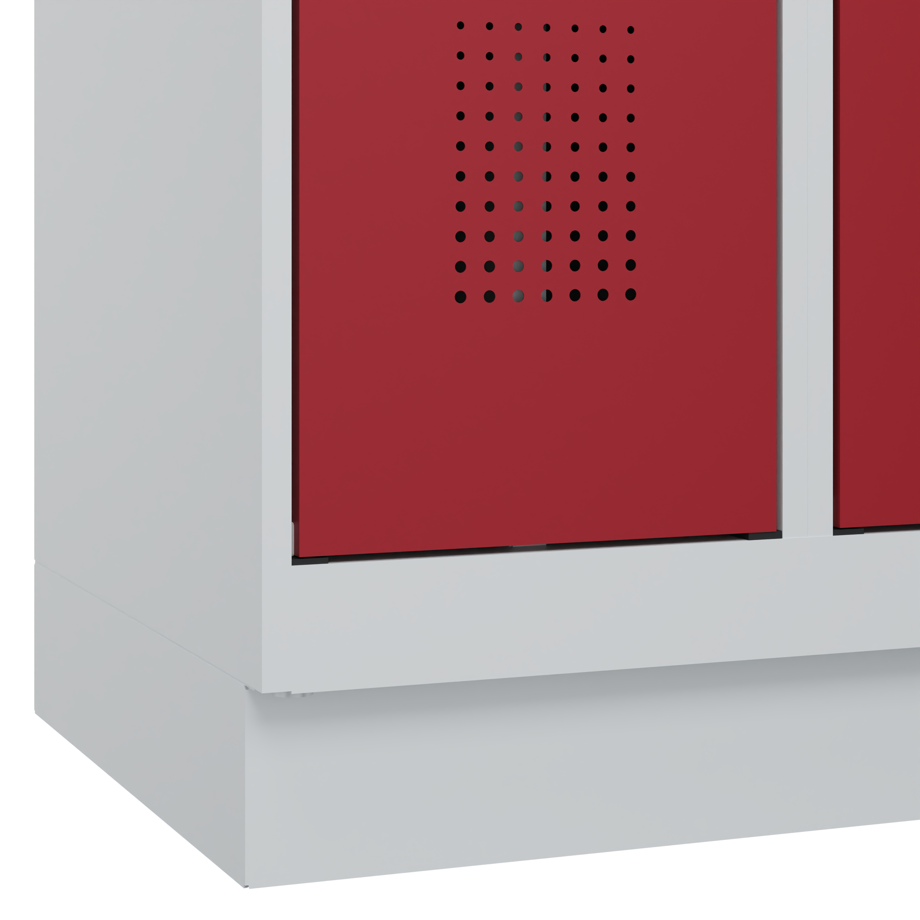 - Verstärkte Türen rechts angeschlagen mit Anschlagdämpfer, Belüftungs-Lochbild und Comfort-Etikettenrahmen sowie Sicherheits-Drehriegel für Vorhangschloss, inkl. Türschutz