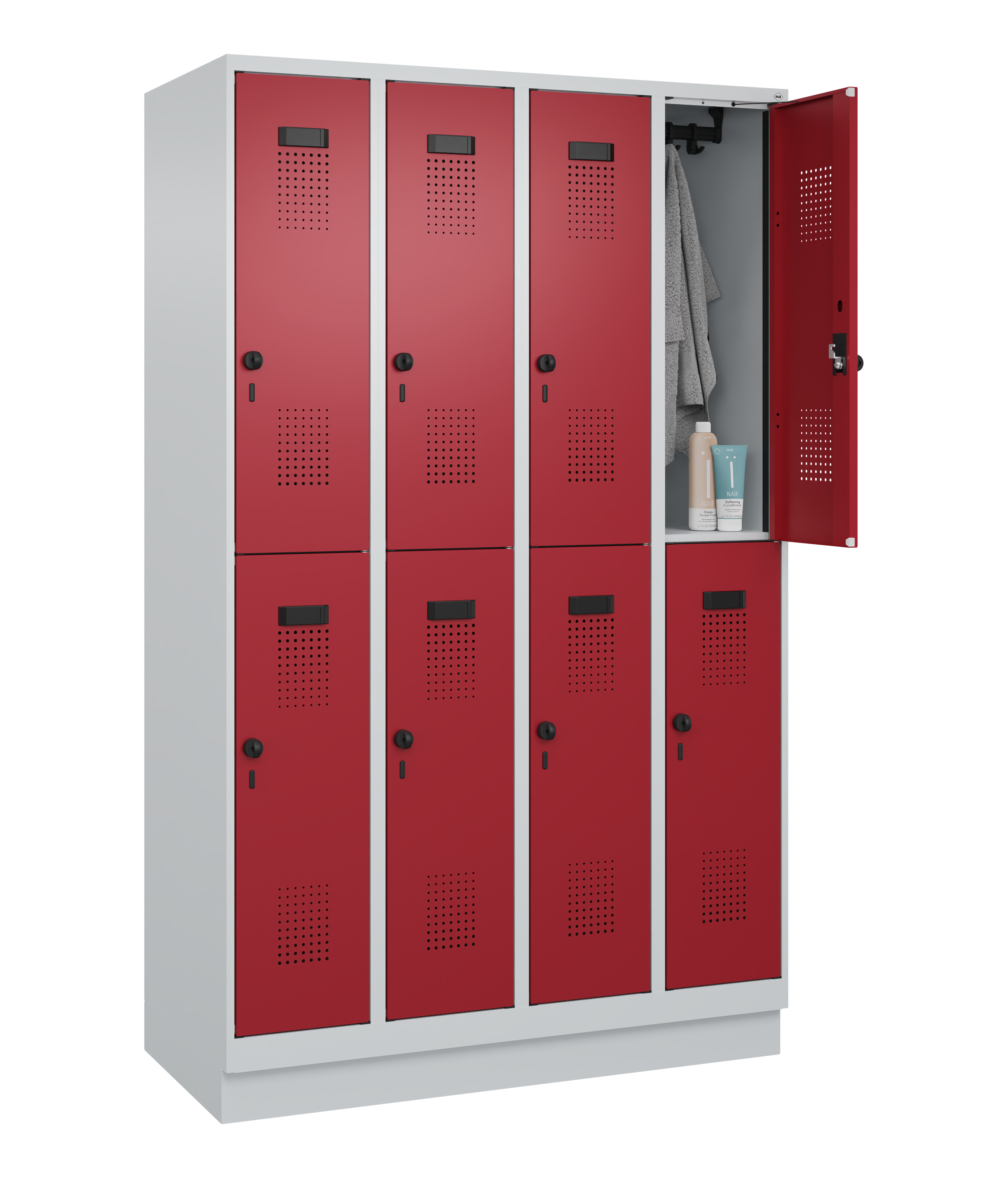 - Verstärkte Türen rechts angeschlagen mit Anschlagdämpfer, Belüftungs-Lochbild und Comfort-Etikettenrahmen sowie Sicherheits-Drehriegel für Vorhangschloss, inkl. Türschutz