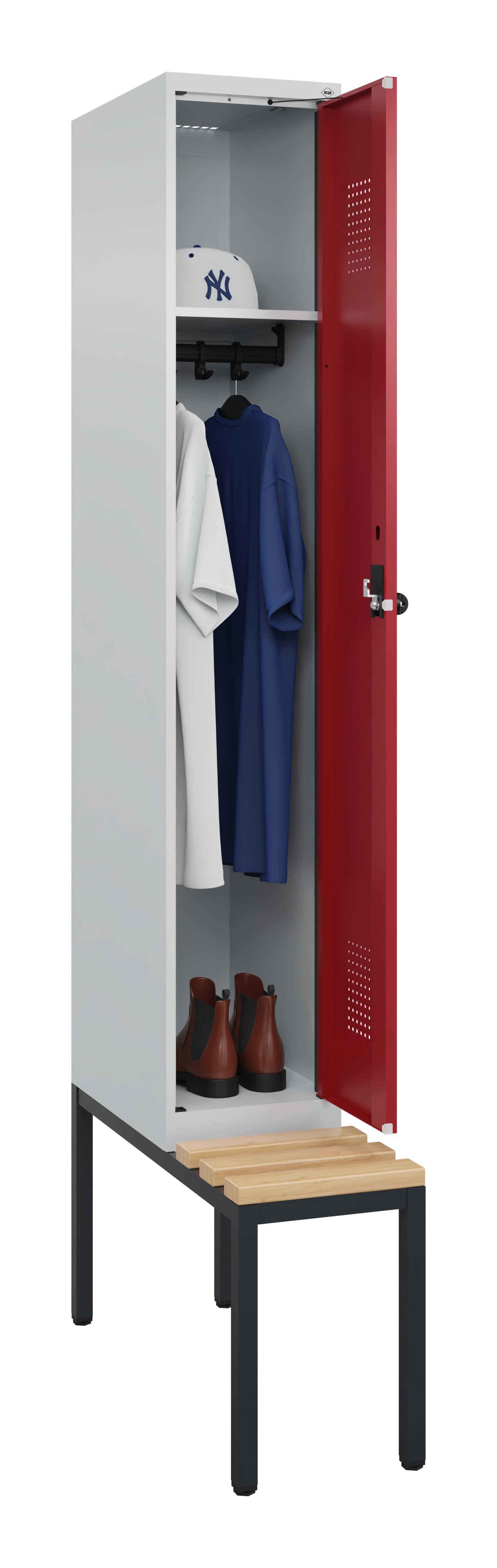 - Einstöckiger Schrank: Innen pro Abteil 1 fest verschweißter Ablageboden, darunter stabile Garderobenstange mit 3 verdrehsicheren Doppel-Schiebehaken (Traglast pro Stange 40 kg, pro Doppelhaken 15 kg)