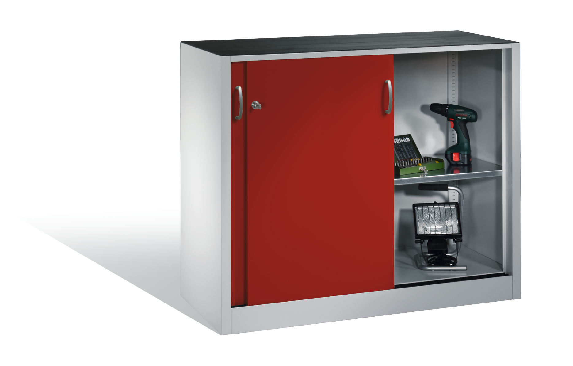 - 1 höhenverstellbare verzinkte Einlegeböden, bei Schränken mit Mittelwand, 2 x 1 Einlegeböden Traglast bei gleichmäßig verteilter Last je Boden ca. 70 kg.