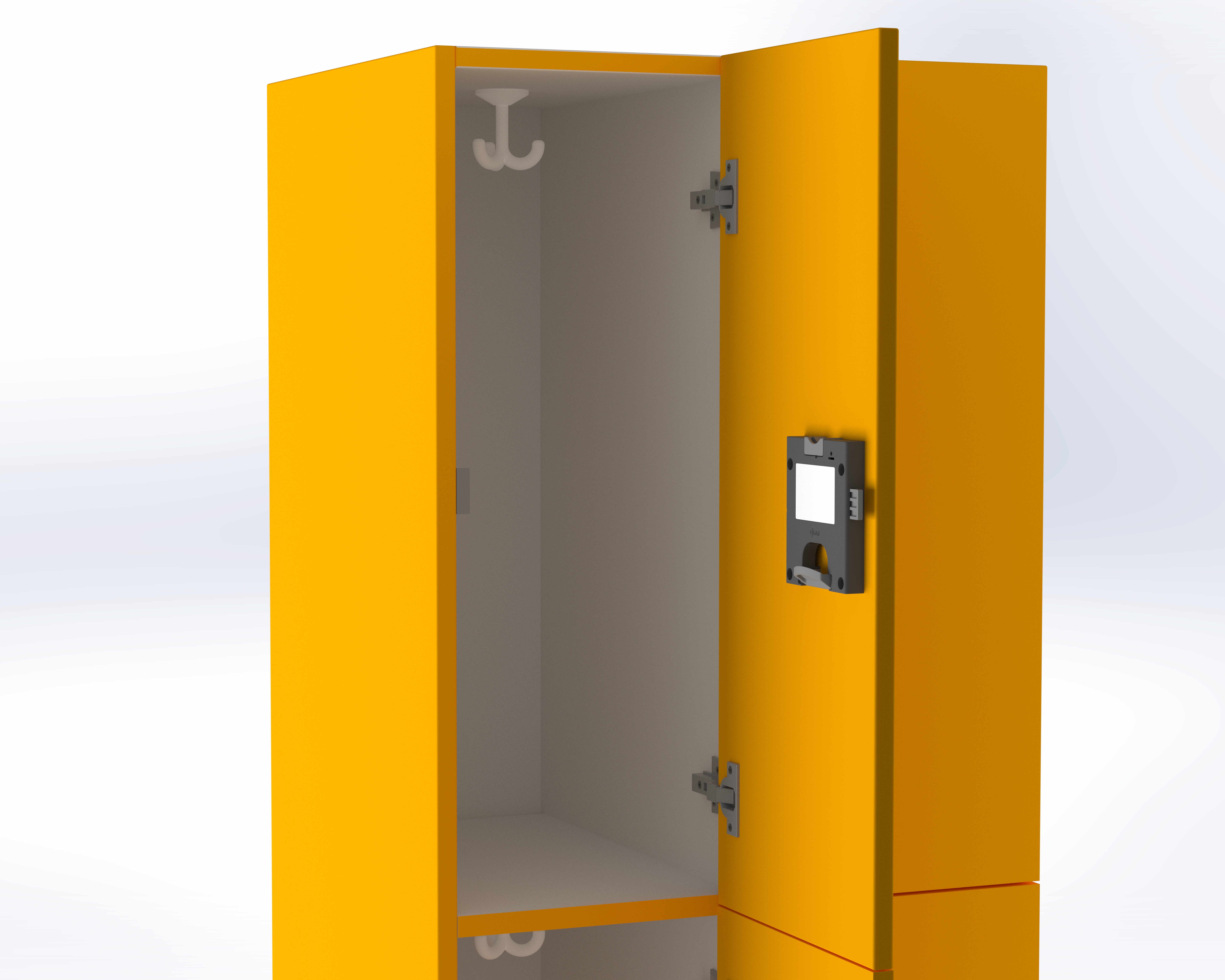 - Beschlag je Türe/Fach 3 Ganzmetalltopfbänder bei 1-türigen Schränken, 2 Ganzmetalltopfbänder bei Garderobenschränken mit 2 Fächern übereinander und Wertfachschränken, Öffnungswinkel 110°, 1 Kastenfallenschloss mit federnder Falle und Stiftzylinder verschieden schließend