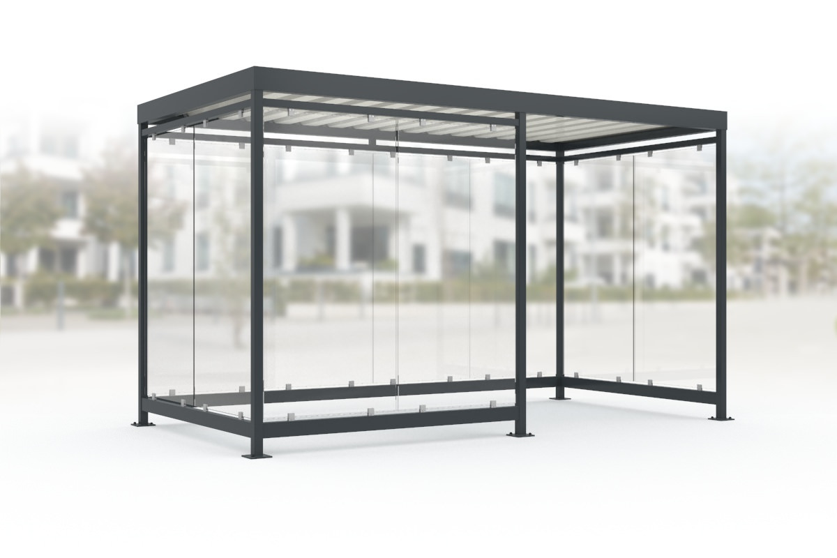 Mit diesem eleganten System entstehen in kurzer Zeit gut einsehbare Überdachungen. Die Wandelemente mit Glasdekor (auf Anfrage) aus ESG-Sicherheitsglas sind mit Glashaltern dezent an der Stahlkonstruktion befestigt.