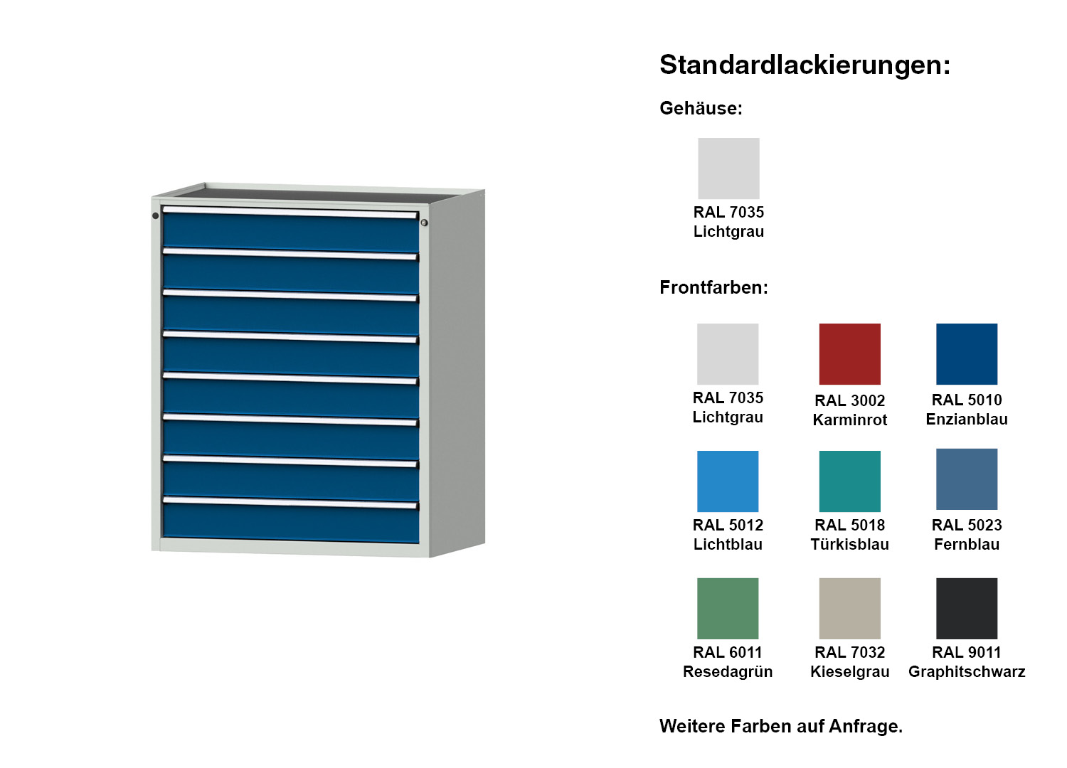 - Frontfarben: RAL 3002, 5010, 5012, 5018, 5023,