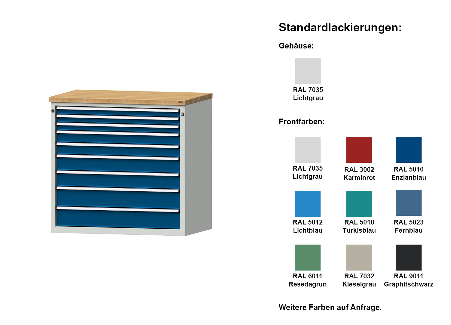- Frontfarben: RAL 3002, 5010, 5012, 5018, 5023,