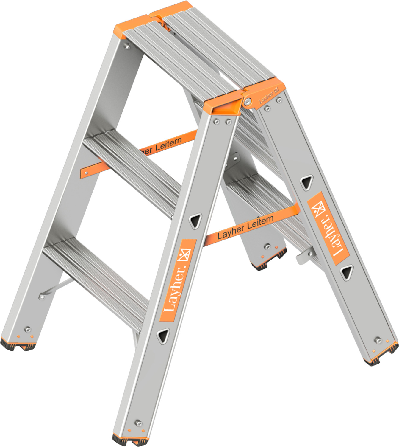- Die klassische Ausführung der Stehleiter mit bequemen breiten Stufen.