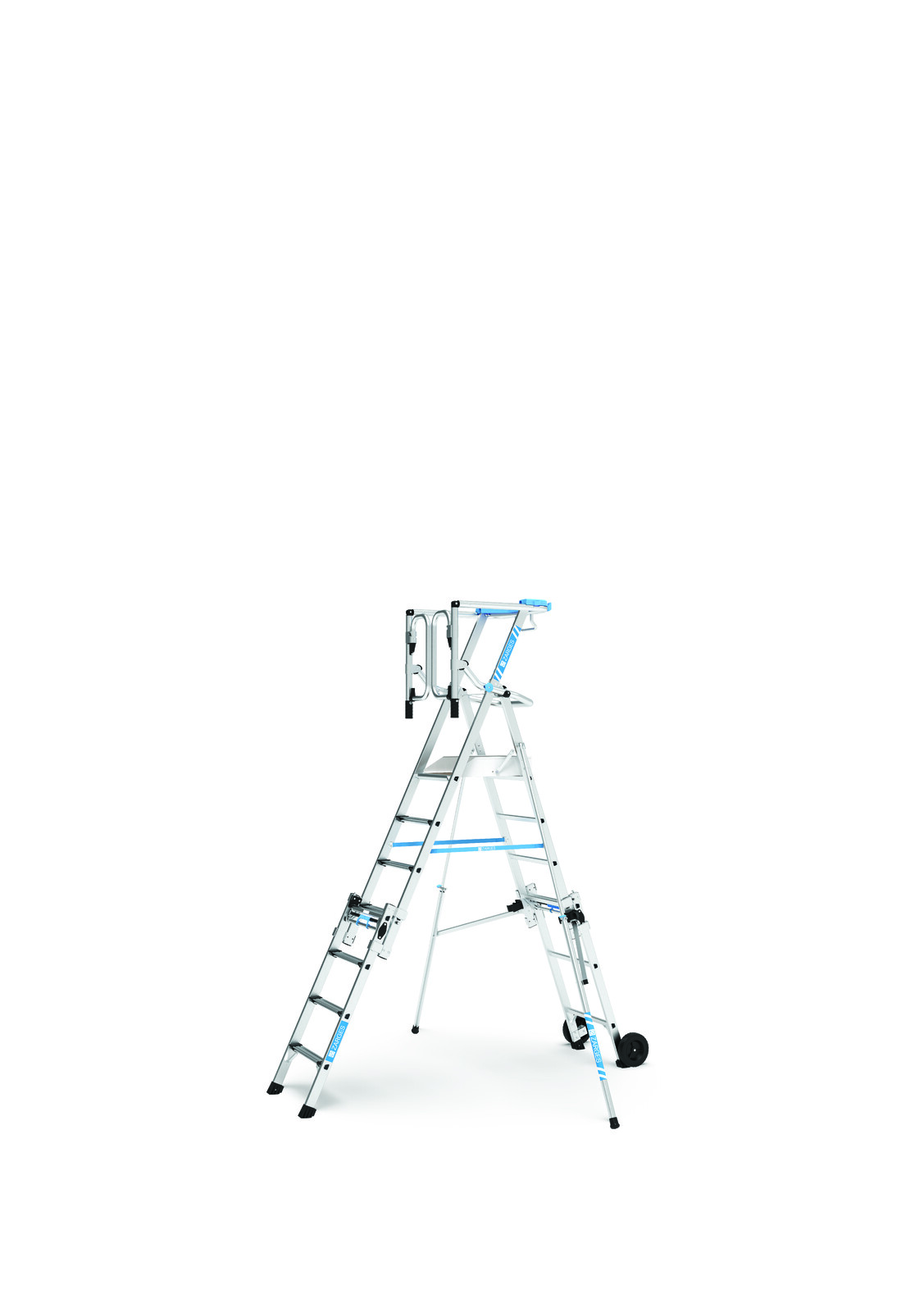- Maximal sicheres und beidhändiges 360° Arbeiten in verschiedenen Höhen auf großflächiger Plattform (B x L 400 x 550 mm) mit solidem, umlaufendem Geländer und automatischer Sicherheits-Saloontüre.