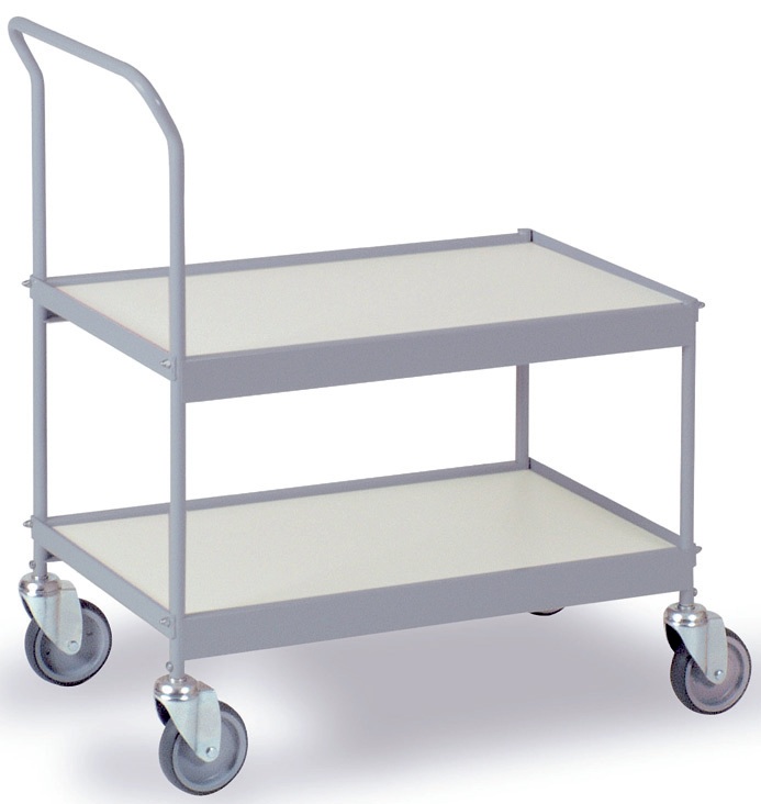 Ergonomischer Tischwagen mit niedriger Ladehöhe und hohem Schiebegriff.