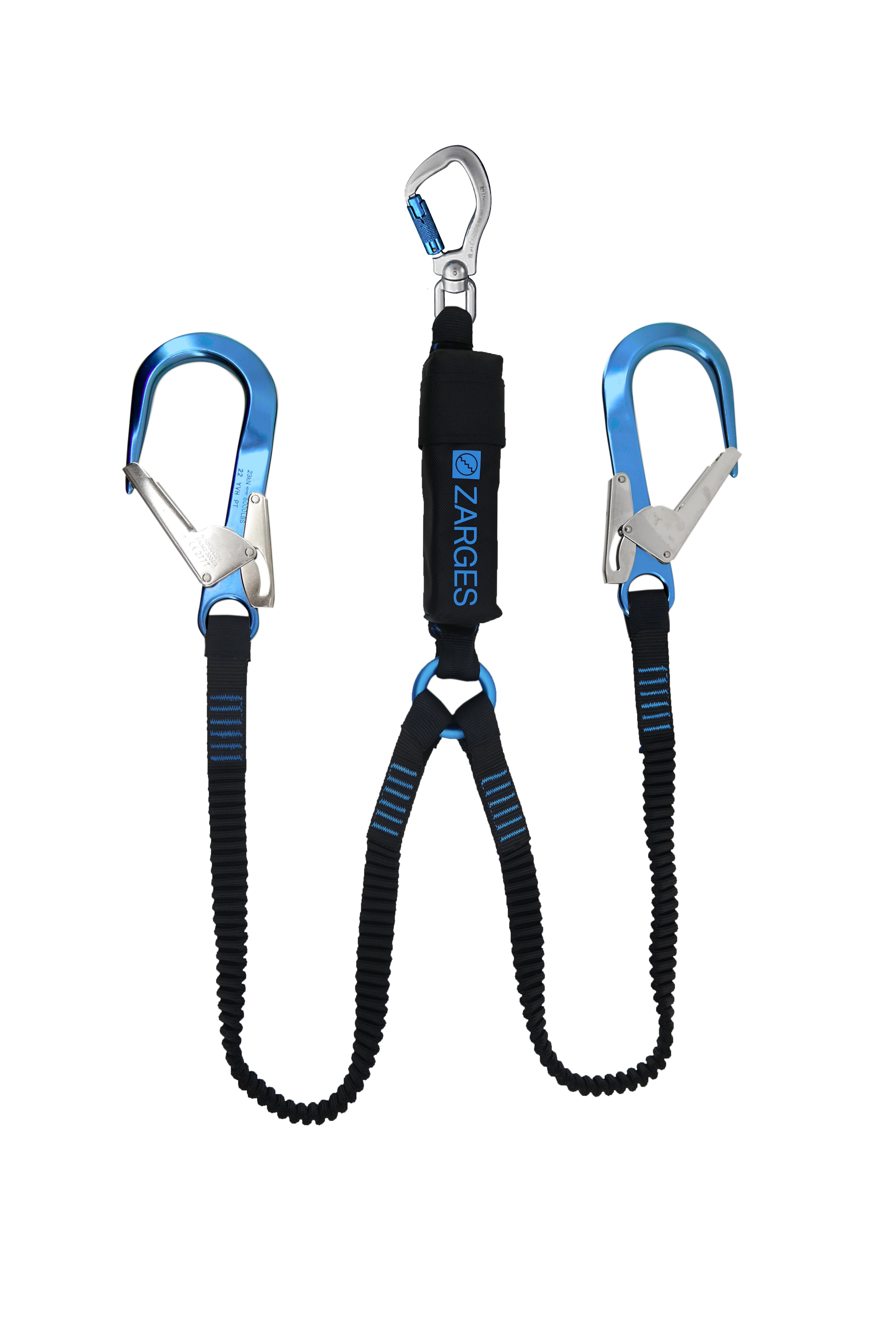 - Zweiseträngiges Verbindungsmittel gemäß EN 354:2010 mit Falldämpfer gemäß EN 355:2002.