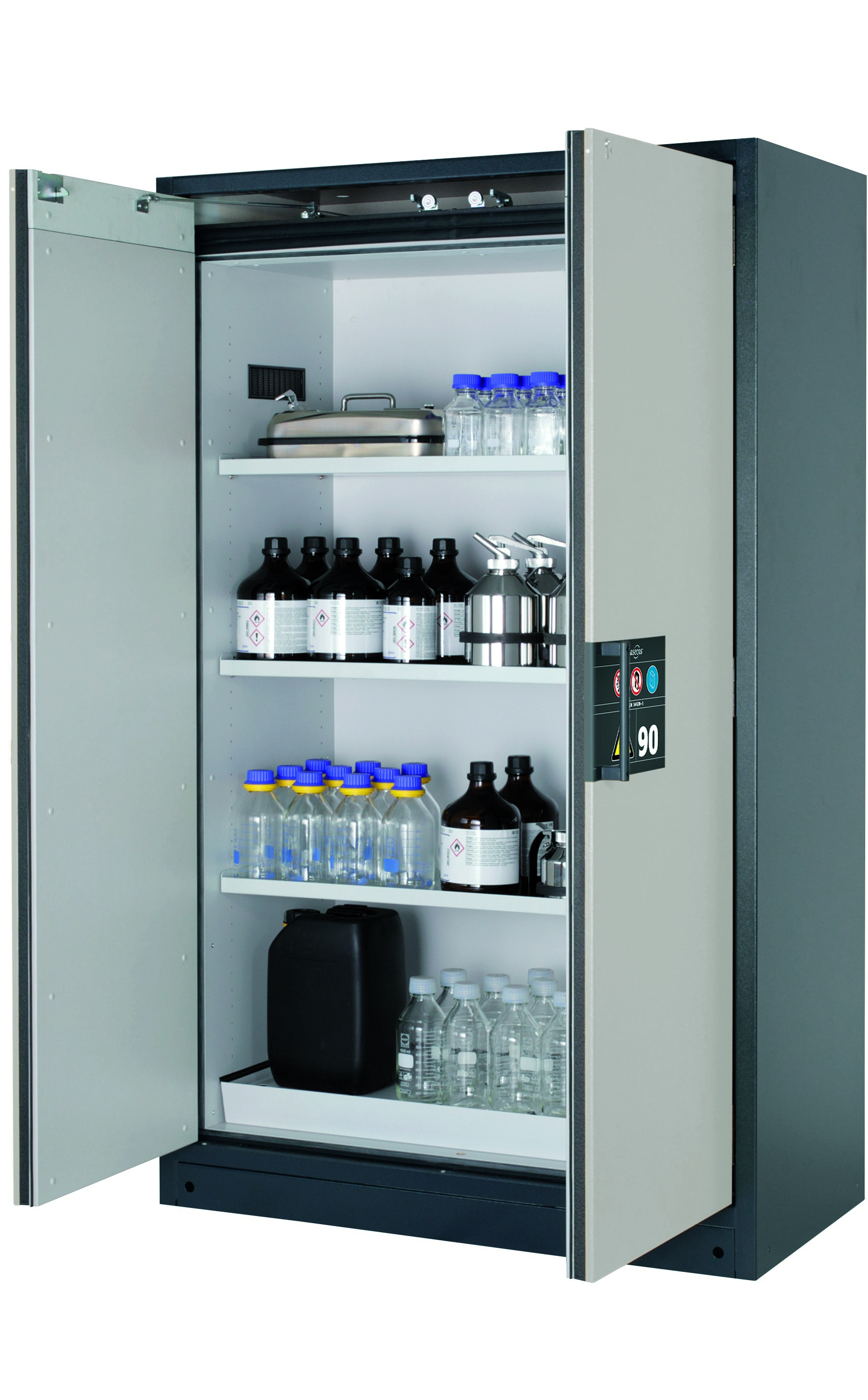 Hochschrank mit Flügeltüren, mit Profilzylinderschließung u. Schließstands- anzeige, integrierte Stellfüße zum Ausgleich von Bodenunebenheiten Abmessungen: Außen: 1193 x 615 x 1953 mm (BxTxH) Innen: 1050 x 522 x 1647 mm (BxTxH) Ausstattungspaket Nr. 30003, best. aus: 3x Fachboden Stahlbl. besch. RAL 7035 1x Lochblecheinsatz Stahlbl. besch. RAL 7035 1x Bodenauffangwanne Stahlbl. besch. RAL 7035