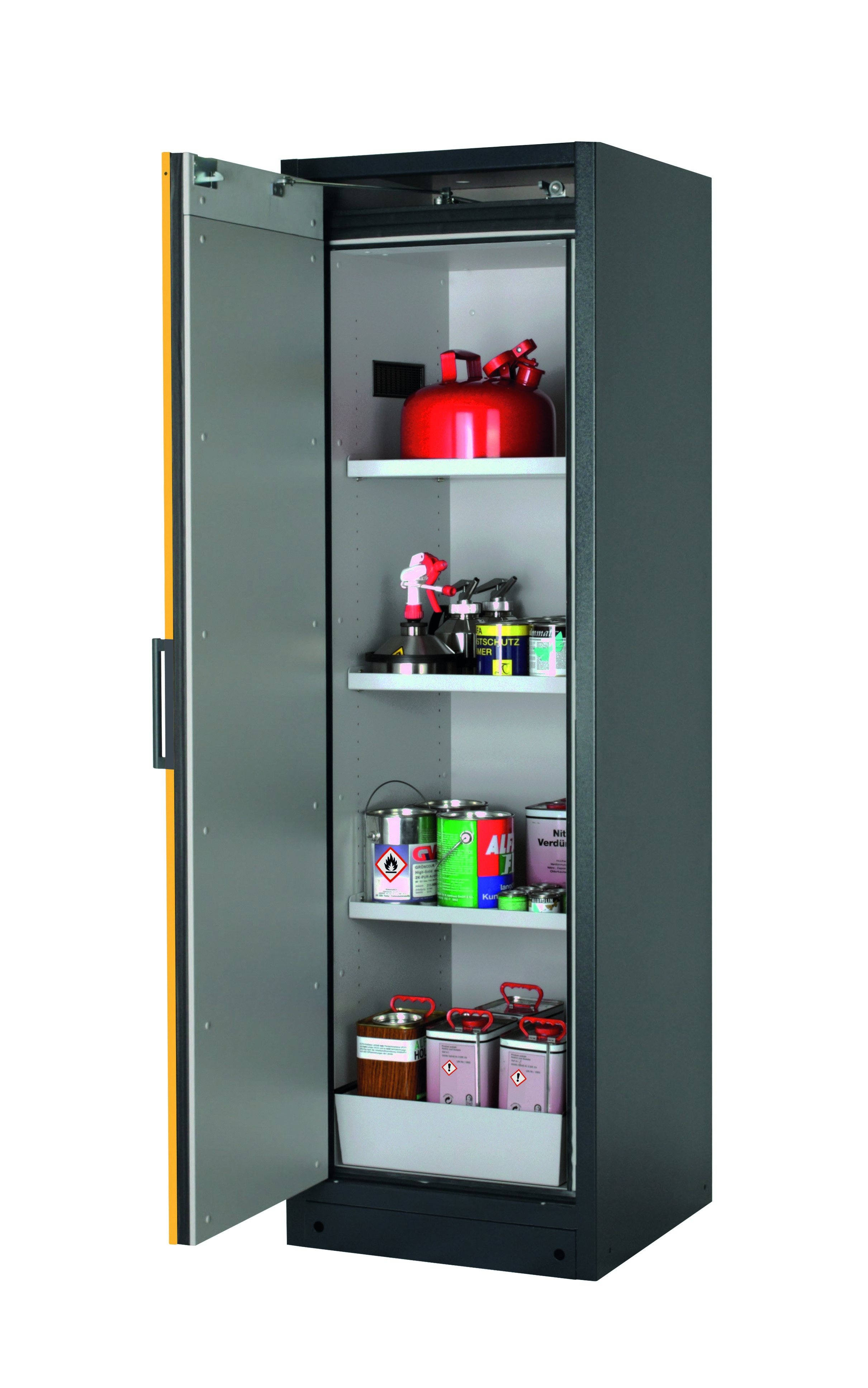 Wahlweise mit 3 höhenverstellbaren Fachböden (32 mm Raster), Lochblecheinsatz und Bodenauffangwanne gemäß StawaR