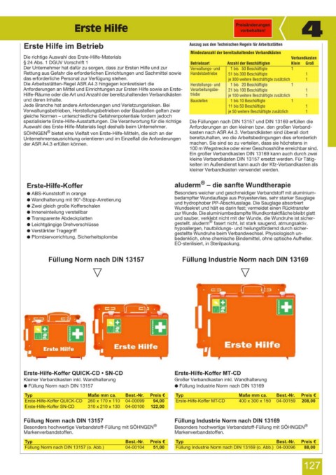 spezialisierte Erste-Hilfe-Ausstattungen. Die Verantwortung für die richtige Die Füllungen nach DIN 13157 und DIN 13169 erfüllen die