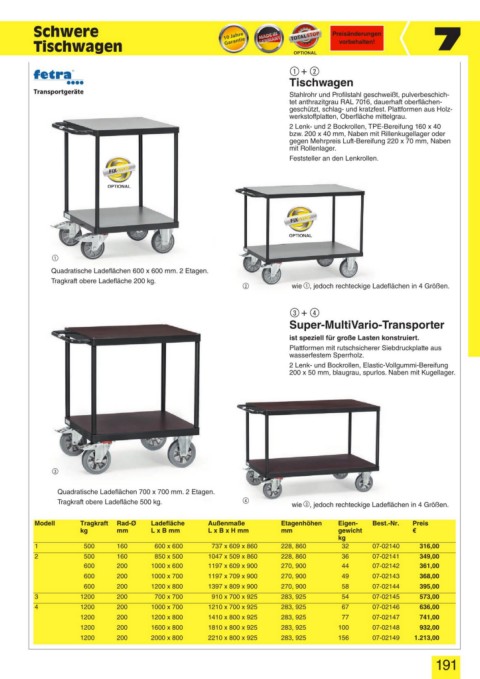 Modell Tragkraft Rad-Ø Ladefläche Außenmaße Etagenhöhen Eigen- Best.-Nr. Preis