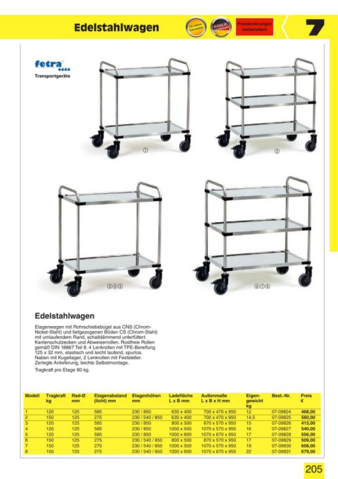 Modell Tragkraft Rad-Ø Etagenabstand Etagenhöhen Ladefläche Außenmaße Eigen- Best.-Nr. Preis