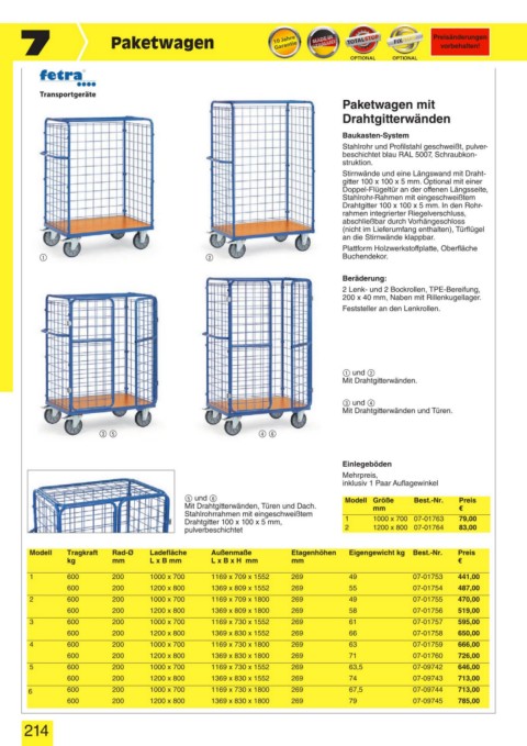 Modell Tragkraft Rad-Ø Ladefläche Außenmaße Etagenhöhen Eigengewicht kg Best.-Nr. Preis