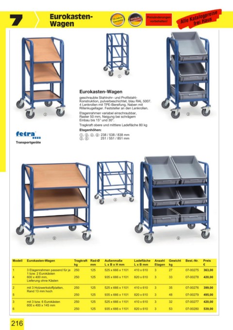 Modell Eurokasten-Wagen Tragkraft Rad-Ø Außenmaße Ladefläche Anzahl Gewicht Best.-Nr. Preis