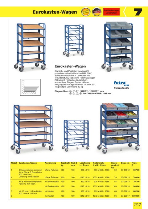 Modell Eurokasten-Wagen Ausführung Tragkraft Rad-Ø Ladefläche Außenmaße Eigen- Best.-Nr. Preis