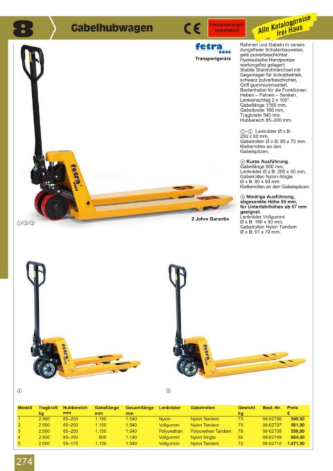 Modell Tragkraft Hubbereich Gabellänge Gesamtlänge Lenkräder Gabelrollen Gewicht Best.-Nr. Preis