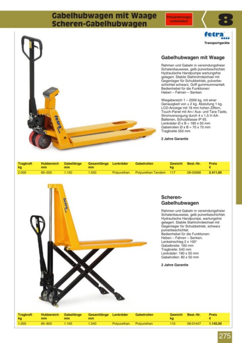 Tragkraft Hubbereich Gabellänge Gesamtlänge Lenkräder Gabelrollen Gewicht Best.-Nr. Preis