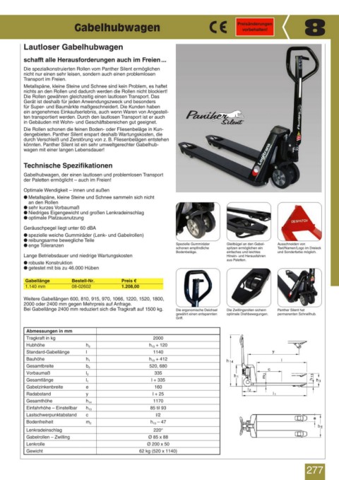 Bei Gabellänge 2400 mm reduziert sich die Tragkraft auf 1500 kg. Die ergonomische Deichsel Die Zwillingsrollen sichern Panther Silent hat