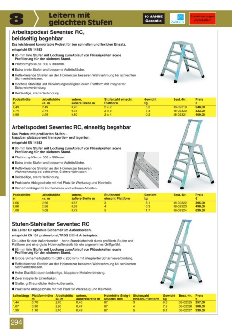 Leiterlänge Plattformhöhe Arbeitshöhe untere, Holmhöhe Steig-/ Stufenzahl Gewicht Best.-Nr. Preis